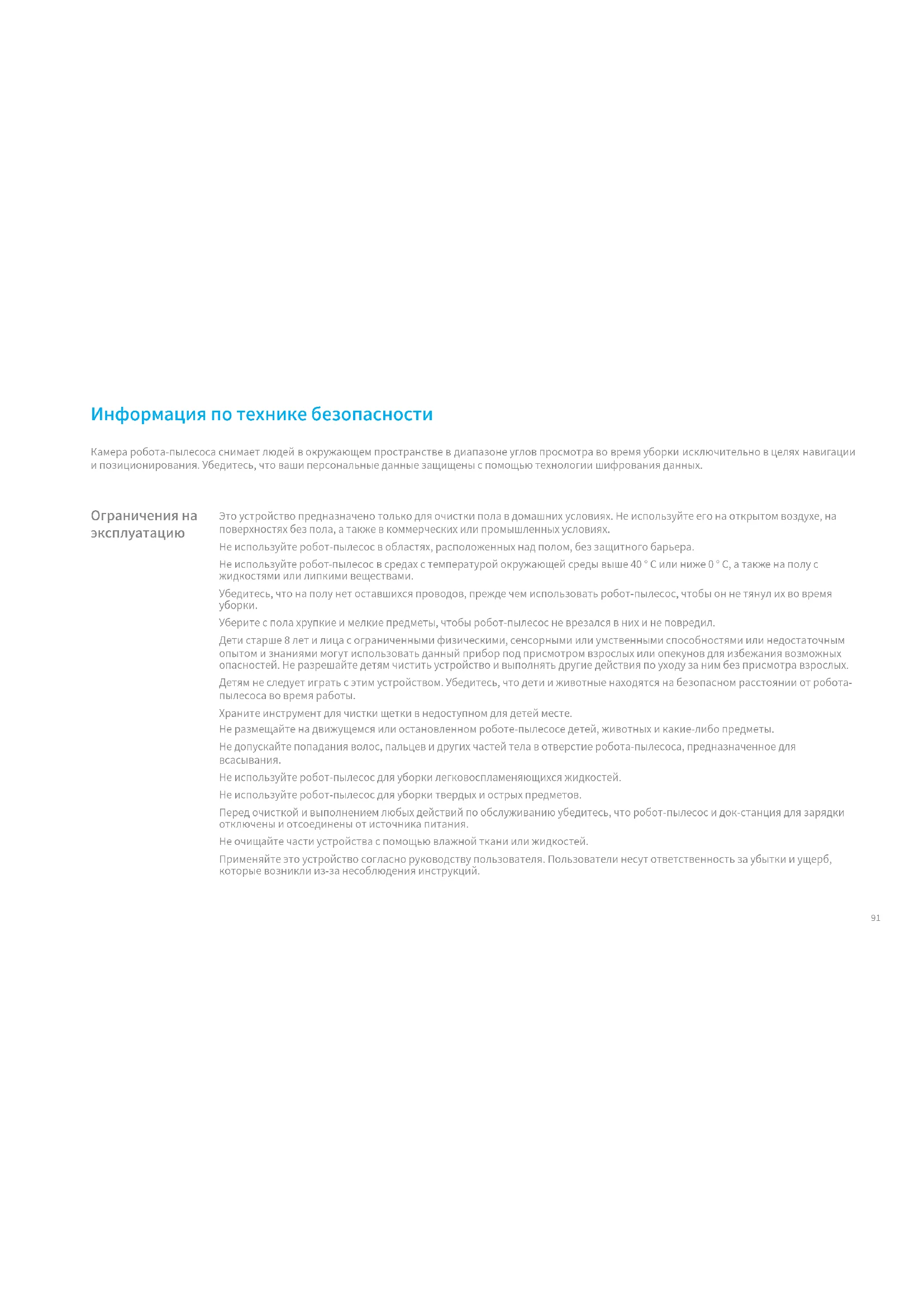 Уберите с пола хрупкие и мелкие предметы, чтобы робот-пылесос не врезался в них и не повредил. Дети старше 8 лет и лица с ограниченными физическими, сенсорными или умственными способностями или недостаточным опытом и знаниями могут использовать данный прибор под присмотром взрослых или опекунов для избежания возможных опасностей. Не разрешайте детям чистить устройство и выполнять другие действия по уходу за ним без присмотра взрослых. Детям не следует играть с этим устройством. Убедитесь, что дети и животные находятся на безопасном расстоянии от робота- пылесоса во время работы. Храните инструмент для чистки щетки в недоступном для детей месте. Не размещайте на движущемся или остановленном роботе-пылесосе детей, животных и какие-либо предметы. Не допускайте попадания волос, пальцев и других частей тела в отверстие робота-пылесоса, предназначенное для всасывания. Не используйте робот-пылесос для уборки легковоспламеняющихся жидкостей. Не используйте робот-пылесос для уборки твердых и острых предметов. Перед очисткой и выполнением любых действий по обслуживанию убедитесь, что робот-пылесос и док-станция для зарядки отключены и отсоединены от источника питания. Не очищайте части устройства с помощью влажной ткани или жидкостей. Применяйте это устройство согласно руководству пользователя. Пользователи несут ответственность за убытки и ущерб, которые возникли из-за несоблюдения инструкций. Камера робота-пылесоса снимает людей в окружающем пространстве в диапазоне углов просмотра во время уборки исключительно в целях навигации и позиционирования. Убедитесь, что ваши персональные данные защищены с помощью технологии шифрования данных.92 Аккумулятор и