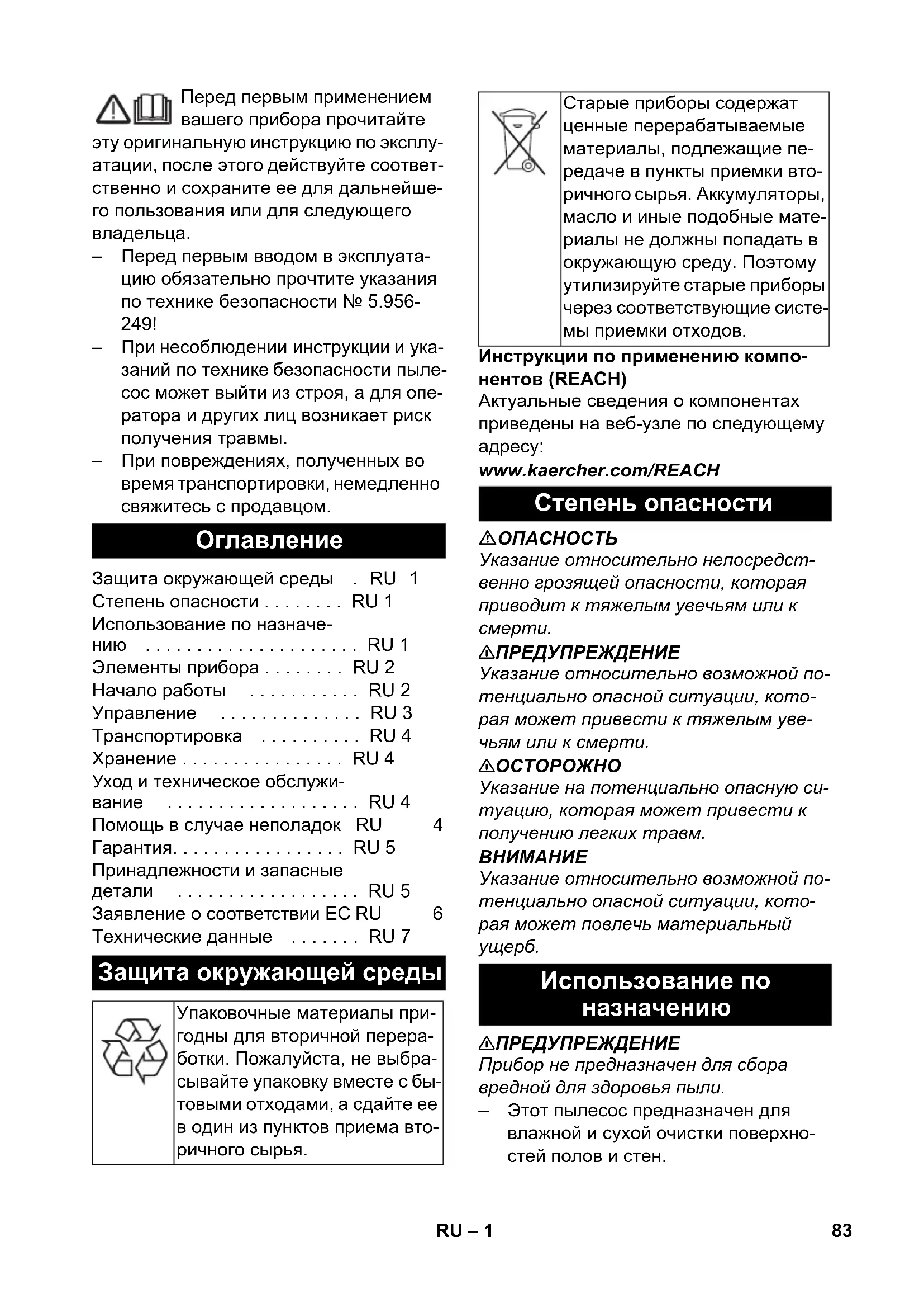 – Перед первым вводом в эксплуата- цию обязательно прочтите указания по технике безопасности № 5.956- 249! – При несоблюдении инструкции и ука- заний по технике безопасности пыле- сос может выйти из строя, а для опе- ратора и других лиц возникает риск получения травмы. – При повреждениях, полученных во время транспортировки, немедленно свяжитесь с продавцом. Инструкции по применению компо- нентов (REACH) Актуальные сведения о компонентах приведены на веб-узле по следующему
