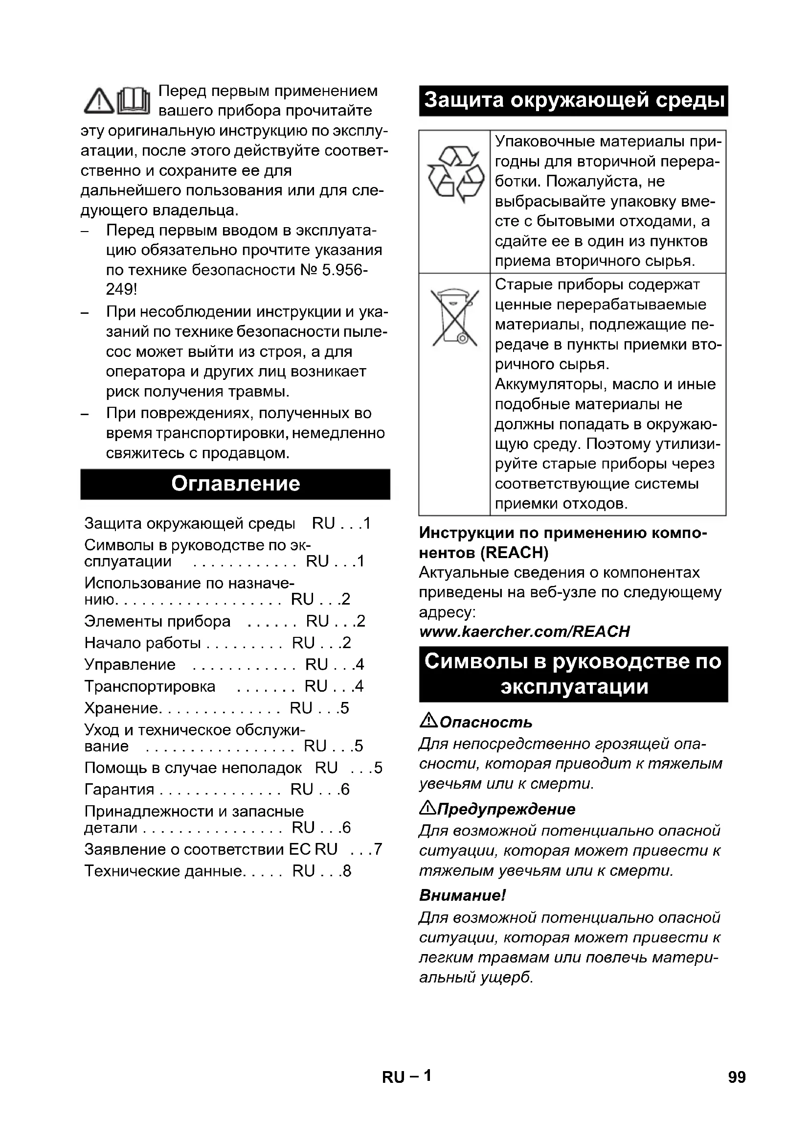 Parça No. Kablo uzunluğu EU 6.649-915.0 10 m 98 TR– 1 Перед первым применением вашего прибора прочитайте эту оригинальную инструкцию по эксплу- атации, после этого действуйте соответ- ственно и сохраните ее для дальнейшего пользования или для сле- дующего владельца. – Перед первым вводом в эксплуата- цию обязательно прочтите указания по технике безопасности № 5.956- 249! – При несоблюдении инструкции и ука- заний по технике безопасности пыле- сос может выйти из строя, а для оператора и других лиц возникает риск получения травмы. – При повреждениях, полученных во время транспортировки, немедленно свяжитесь с продавцом. Инструкции по применению компо- нентов (REACH) Актуальные сведения о компонентах приведены на веб-узле по следующему
