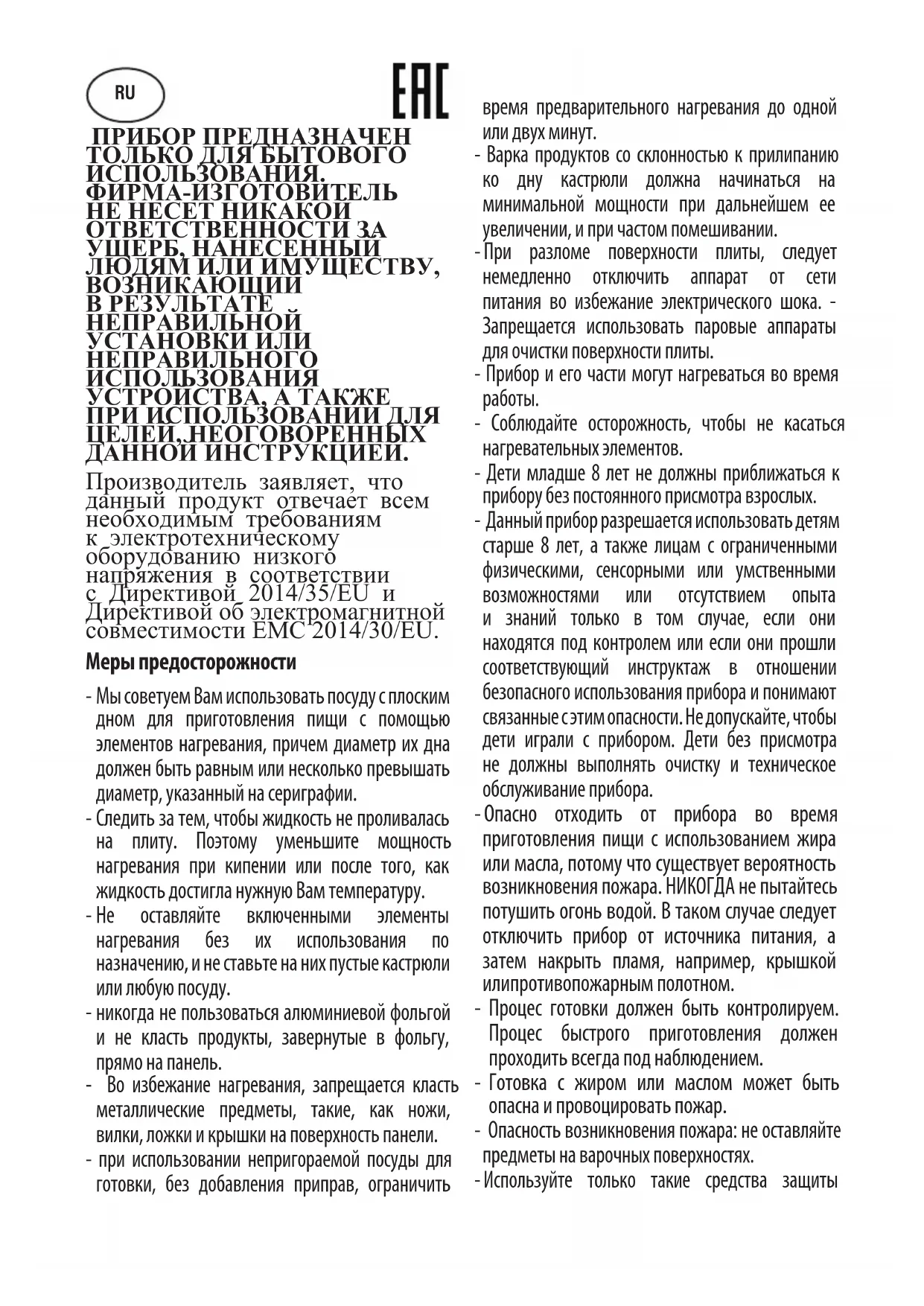 - Соблюдайте осторожность, чтобы не касаться нагревательных элементов. - Дети младше 8 лет не должны приближаться к прибору без постоянного присмотра взрослых. - Данный прибор разрешается использовать детям старше 8 лет, а также лицам с ограниченными физическими, сенсорными или умственными возможностями или отсутствием опыта и знаний только в том случае, если они находятся под контролем или если они прошли соответствующий инструктаж в отношении безопасного использования прибора и понимают связанные с этим опасности. Не допускайте, чтобы дети играли с прибором. Дети без присмотра не должны выполнять очистку и техническое обслуживание прибора. - Опасно отходить от прибора во время приготовления пищи с использованием жира или масла, потому что существует вероятность возникновения пожара. НИКОГДА не пытайтесь потушить огонь водой. В таком случае следует отключить прибор от источника питания, а затем накрыть пламя, например, крышкой илипротивопожарным полотном. - Процес готовки должен быть контролируем. Процес быстрого приготовления должен проходить всегда под наблюдением. - Готовка с жиром или маслом может быть опасна и провоцировать пожар. - Опасность возникновения пожара: не оставляйте предметы на варочных поверхностях. - Используйте только такие средства защиты RUстолешницы, которые разработаны производителем прибора для приготовления или указаны производителем в инструкциях по применению, либо средства защиты столешницы, которые входят в комплект поставки прибора. Использование неподходящих средств защиты может привести к возникновению несчастных