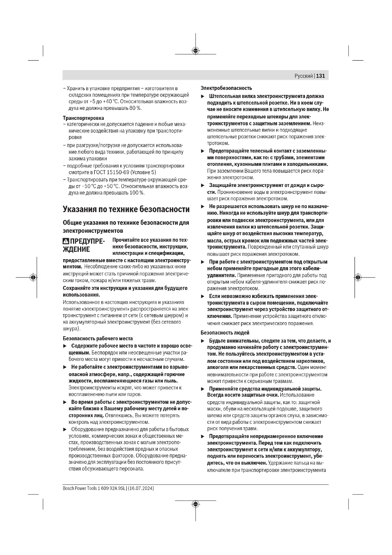 – хранение без упаковки не допускается – подробные требования к условиям хранения смотрите в ГОСТ15150-69 (Условие1) 1 609 92A 9SL | (16.07.2024) Bosch Power ToolsРусский | 131 – Хранить в упаковке предприятия– изготовителя в складских помещениях при температуре окружающей среды от +5 до +40°С. Относительная влажность воз- духа не должна превышать 80%. Транспортировка – категорически не допускается падение и любые меха- нические воздействия на упаковку при транспорти-