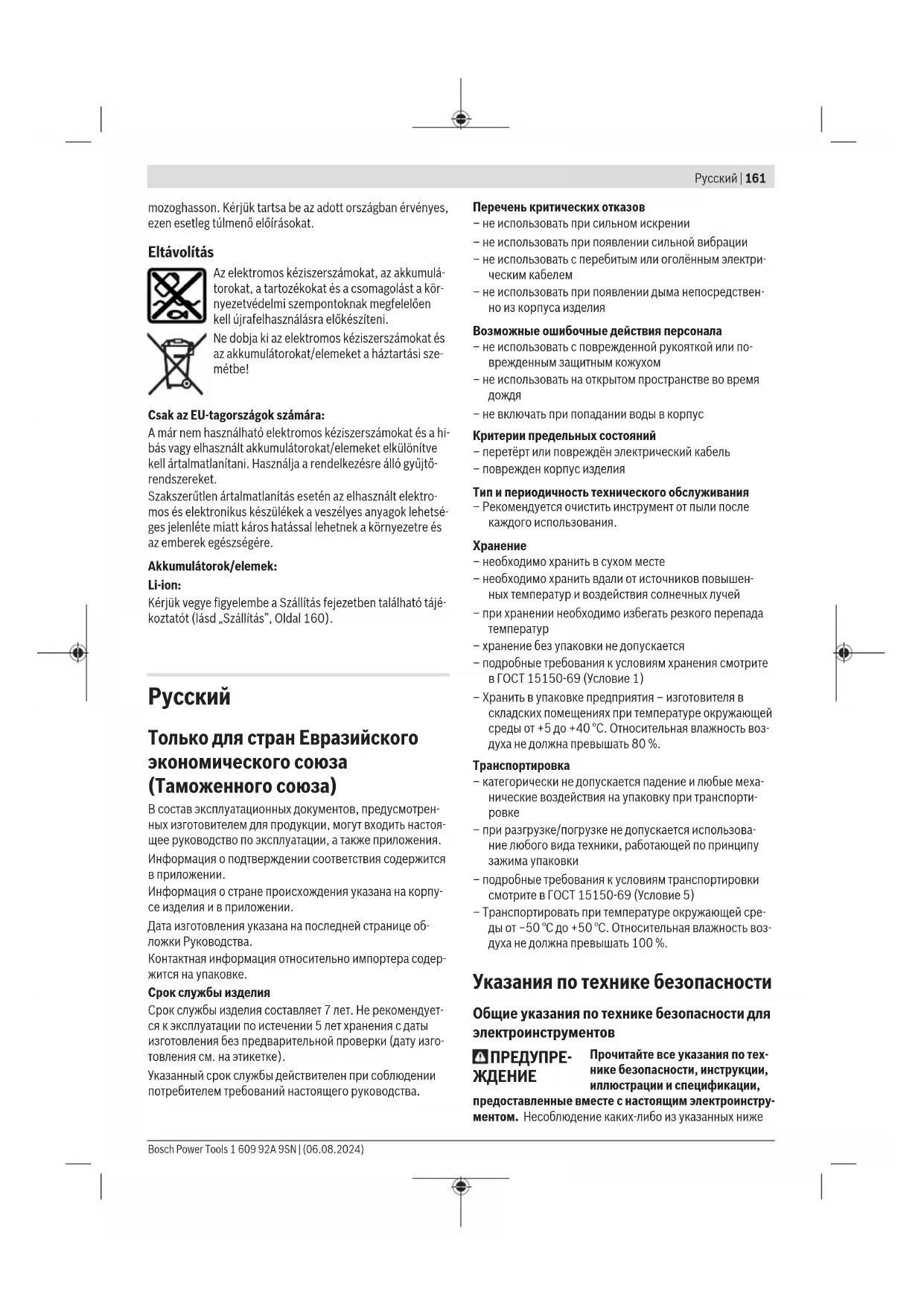 Уполномоченная изготовителем организация: ООО «Роберт Бош» Вашутинское шоссе, вл. 24 141400, г. Химки, Московская обл. Тел.: +7 800 100 8007 E-Mail: info.powertools@ru.bosch.com www.bosch-pt.ru Прочие сервисные адреса находятся на: www.bosch-pt.com/serviceaddresses В случае выхода электроинструмента из строя в течение гарантийного срока эксплуатации по вине изготовителя, владелец имеет право на бесплатный гарантийный ре- монт, при соблюдении следующих условий: – отсутствие механических повреждений; – отсутствие признаков нарушения требований руко- водства по эксплуатации – наличие в руководстве по эксплуатации отметки про- давца о продаже и подписи покупателя; – соответствие серийного номера электроинструмента и серийному номеру в гарантийном талоне; – отсутствие следов неквалифицированного ремонта. Гарантия не распространяется на: – любые поломки, связанные с форс-мажорными обсто- ятельствами; – нормальный износ: электроинструмента, так же, как и все электрические. Гарантией не покрывается ремонт, потребность в кото- ром возникает вследствие нормального износа, сокра- щающего срок службы таких частей инструмента, как присоединительные контакты, провода, щётки и т.п.: – естественный износ (полная выработка ресурса); – оборудование и его части, выход из строя которых стал следствием неправильной установки, несанкцио- нированной модификации, неправильного примене- ния, нарушение правил обслуживания или хранения; – неисправности, возникшие в результате перегрузки электроинструмента. (К безусловным признакам пере- грузки инструмента относятся: появление цвета побе- жалости, деформация или оплавление деталей и узлов электроинструмента, потемнение или обугливание изоляции проводов электродвигателя под действием высокой температуры.) Транспортировка На вложенные литий-ионные аккумуляторные батареи распространяются требования в отношении транспорти- ровки опасных грузов. Аккумуляторные батареи могут перевозиться самим пользователем автомобильным транспортом без необходимости соблюдения дополни- тельных норм. При пересылке третьими лицами (напр.: самолетом или транспортным экспедитором) необходимо соблюдать особые требования к упаковке и маркировке. В этом слу- чае при подготовке груза к отправке необходимо участие эксперта по опасным грузам. Пересылайте аккумуляторную батарею только в том слу- чае, если корпус не поврежден. Заклейте открытые кон- такты и упакуйте аккумуляторную батарею так, чтобы она не болталась в упаковке. Соблюдайте, пожалуйста, также возможные дополнительные национальные предписа-