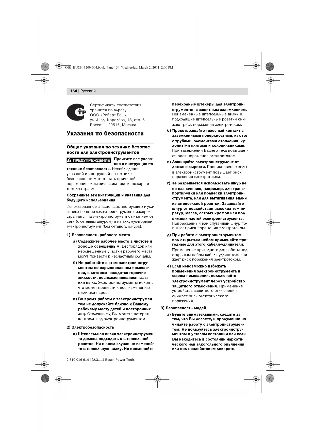а) Будьте внимательными, следите за тем, что Вы делаете, и продуманно на- чинайте работу с электроинструмен- том. Не пользуйтесь электроинстру- ментом в усталом состоянии или если Вы находитесь в состоянии наркоти- ческого или алкогольного опьянения или под воздействием лекарств. Сертификаты соответствия хранятся по адресу: ООО «Роберт Бош» ул. Акад. Королёва, 13, стр. 5 Россия, 129515, Москва OBJ_BUCH-1209-004.book Page 154 Wednesday, March 2, 2011 2:00 PMРусский | 155 Bosch Power Tools 2 610 016 614 | (2.3.11) Один момент невнимательности при работе с электроинструментом может привести к серьезным травмам. б) Применяйте средства индивидуальной защиты и всегда защитные очки. Использование средств индивидуальной защиты, как то: защитной маски, обуви на нескользящей подошве, защитного шлема или средств защиты органов слуха, – в зависимости от вида работы с электроинструментом снижает риск получения травм. в) Предотвращайте непреднамеренное включение электроинструмента. Перед подключением электроинструмента к электропитанию и/или к аккумулятору убедитесь в выключенном состоянии электроинструмента. Удержание пальца на выключателе при транспортировке электроинструмента и подключение к сети питания включенного электроинструмента чревато несчастными случаями. г) Убирайте установочный инструмент или гаечные ключи до включения электроинструмента. Инструмент или ключ, находящийся во вращающейся части электроинструмента, может при- вести к травмам. д) Не принимайте неестественное поло- жение корпуса тела. Всегда занимайте устойчивое положение и сохраняйте равновесие. Благодаря этому Вы можете лучше контролировать электро- инструмент в неожиданных ситуациях. е) Носите подходящую рабочую одежду. Не носите широкую одежду и украше- ния. Держите волосы, одежду и рука- вицы вдали от движущихся частей. Широкая одежда, украшения или длин- ные волосы могут быть затянуты вра- щающимися частями. ж)При наличии возможности установки пылеотсасывающих и пылесборных устройств проверяйте их присоеди- нение и правильное использование. Применение пылеотсоса может снизить опасность, создаваемую пылью.