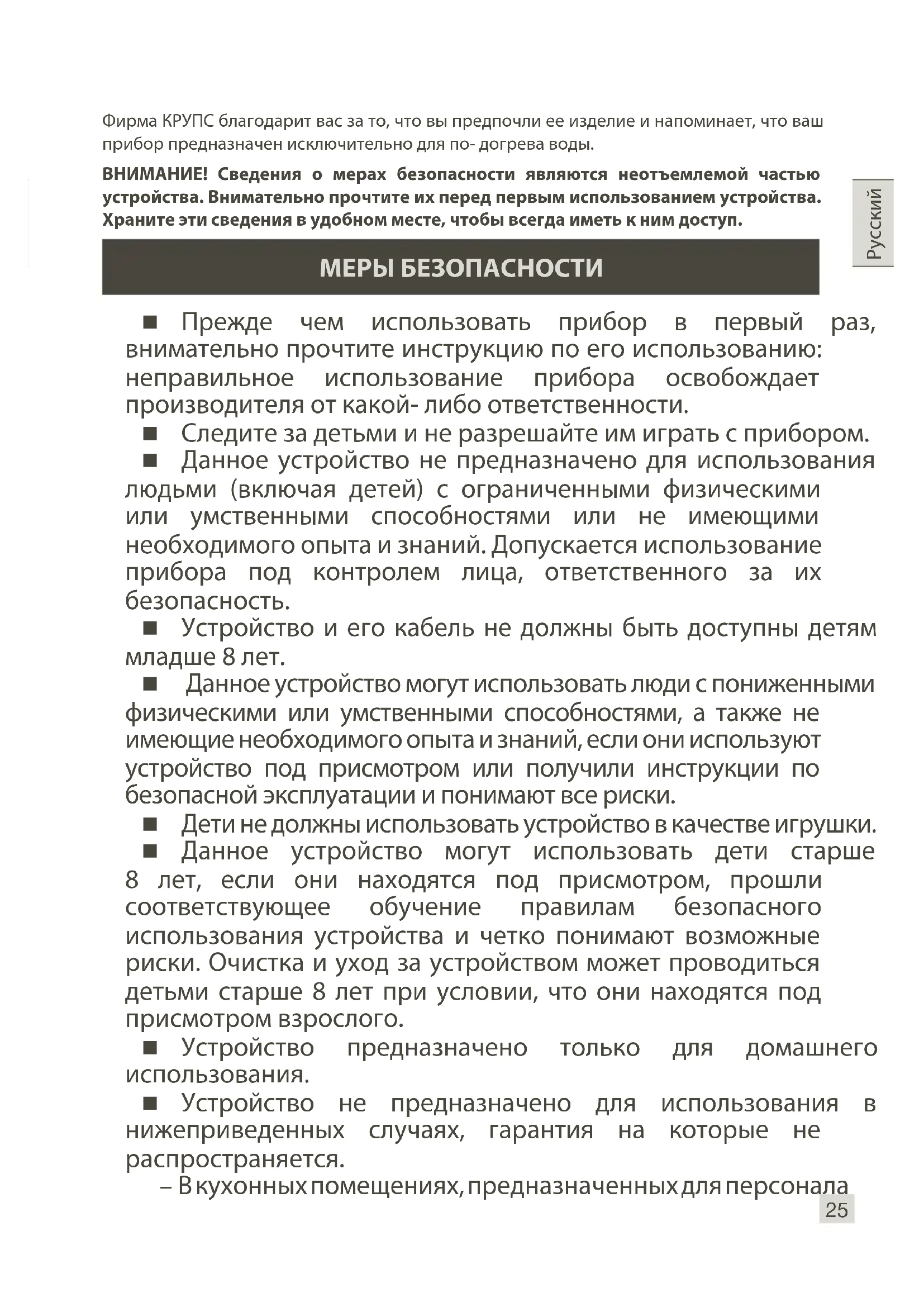 Фирма КРУПС благодарит вас за то, что вы предпочли ее изделие и напоминает, что ваш прибор предназначен исключительно для по- догрева воды. ВНИМАНИЕ! Сведения о мерах безопасности являются неотъемлемой частью устройства. Внимательно прочтите их перед первым использованием устройства. Храните эти сведения в удобном месте, чтобы всегда иметь к ним доступ. Прежде чем использовать прибор в первый раз, внимательно прочтите инструкцию по его использованию: неправильное использование прибора освобождает производителя от какой- либо ответственности. Следите за детьми и не разрешайте им играть с прибором. Данное устройство не предназначено для использования людьми (включая детей) с ограниченными физическими или умственными способностями или не имеющими необходимого опыта и знаний. Допускается использование прибора под контролем лица, ответственного за их безопасность. Устройство и его кабель не должны быть доступны детям младше 8 лет. Данное устройство могут использовать люди с пониженными физическими или умственными способностями, а также не имеющие необходимого опыта и знаний, если они используют устройство под присмотром или получили инструкции по безопасной эксплуатации и понимают все риски. Дети не должны использовать устройство в качестве игрушки. Данное устройство могут использовать дети старше 8 лет, если они находятся под присмотром, прошли соответствующее обучение правилам безопасного использования устройства и четко понимают возможные риски. Очистка и уход за устройством может проводиться детьми старше 8 лет при условии, что они находятся под присмотром взрослого. Устройство предназначено только для домашнего использования. Устройство не предназначено для использования в нижеприведенных случаях, гарантия на которые не распространяется. – В кухонных помещениях, предназначенных для персонала МЕРЫ БЕЗОПАСНОСТИ26 магазинов, в офисах и в других рабочих помещениях. – На фермах. – Клиентами отелей, мотелей и других подобных мест проживания. – В комнатах и квартирах, которые снимаются на короткий