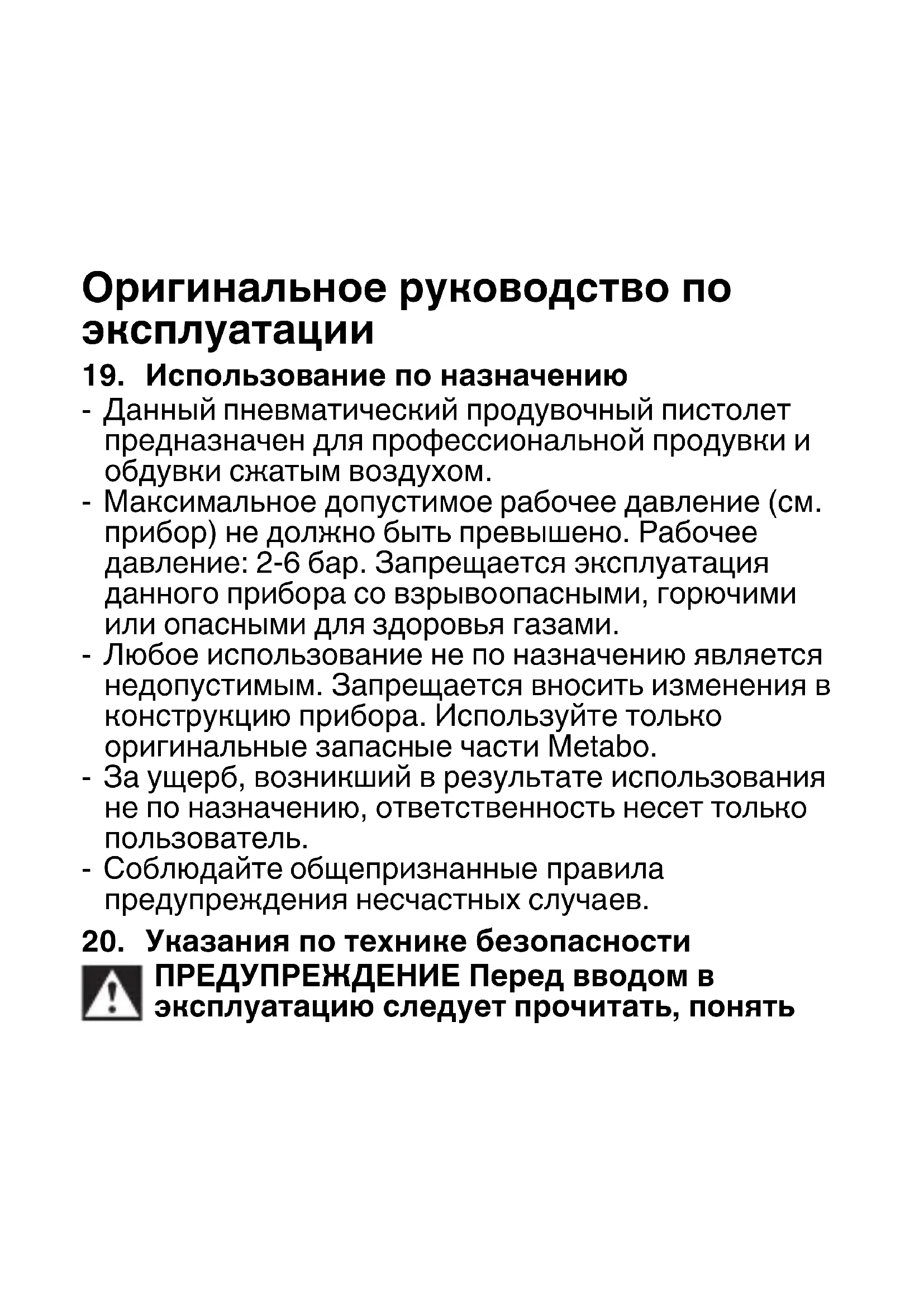 - Данный пневматический продувочный пистолет предназначен для профессиональной продувки и обдувки сжатым воздухом. - Максимальное допустимое рабочее давление (см. прибор) не должно быть превышено. Рабочее давление: 2-6 бар. Запрещается эксплуатация данного прибора со взрывоопасными, горючими или опасными для здоровья газами. - Любое использование не по назначению является недопустимым. Запрещается вносить изменения в конструкцию прибора. Используйте только оригинальные запасные части Metabo. - За ущерб, возникший в результате использования не по назначению, ответственность несет только пользователь. - Соблюдайте общепризнанные правила предупреждения несчастных случаев.