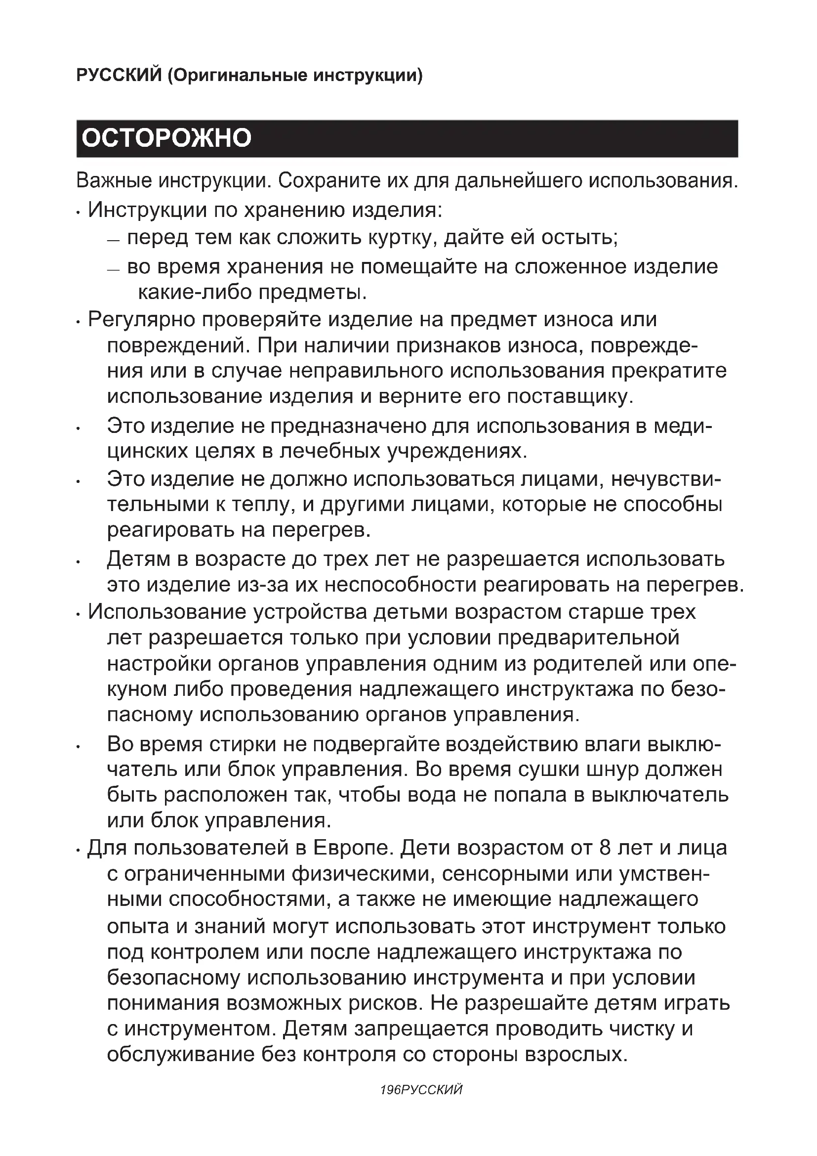 Данное устройство предназначено для согревания тела в условиях низких температур. МЕРЫ БЕЗОПАСНОСТИ ОСТОРОЖНО: Ознакомьтесь со всеми инструкциями и рекомендациями по технике безопасности. Невыполнение инструкций и реко- мендаций может привести к поражению электрото- ком, пожару и/или тяжелым травмам. Сохраните брошюру с инструк- циями и рекомендациями для дальнейшего использования. Под термином “устройство” в предупреждениях и предостережениях подразумевается одеяло и дер- жатель аккумулятора с блоком аккумулятора. Общие правила техники безопасности