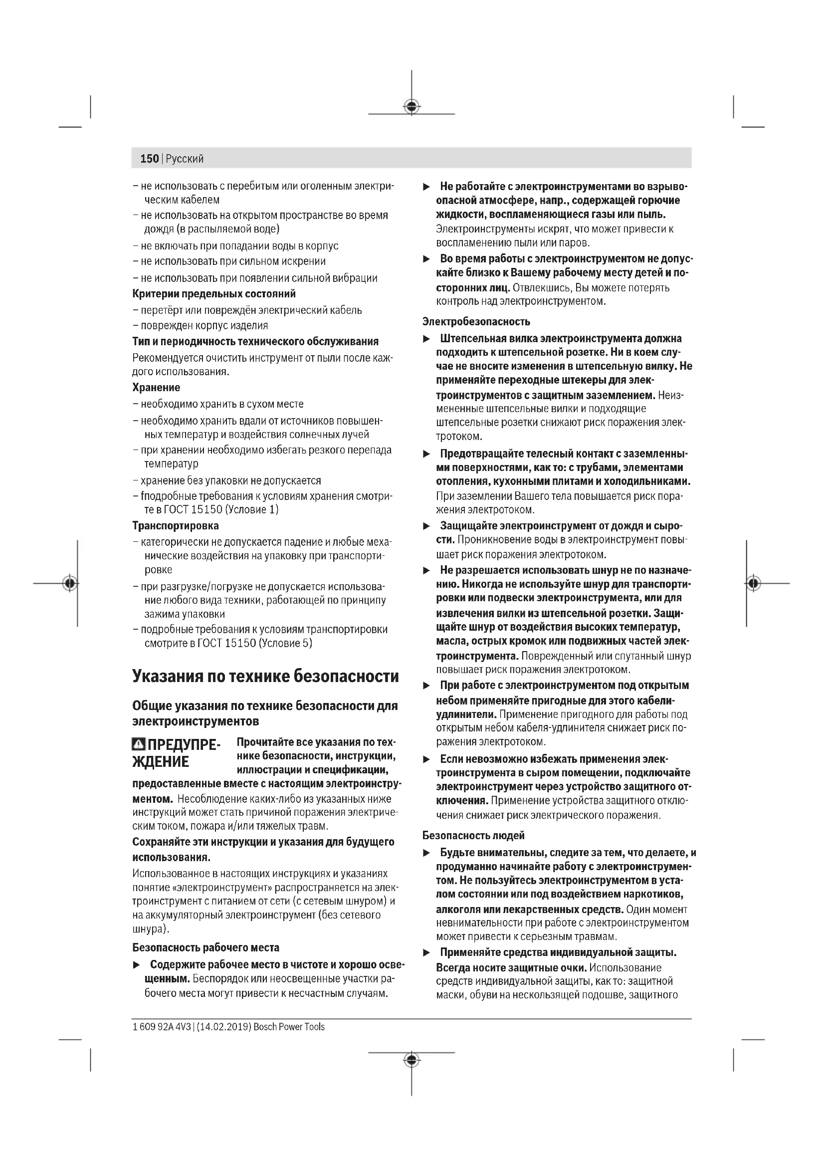 Toлько для стран Евразийского экономического союза (Таможенного союза) В состав эксплуатационных документов, предусмотрен- ных изготовителем для продукции, могут входить настоя- щее руководство по эксплуатации, а также приложения. Информация о подтверждении соответствия содержится в приложении. Информация о стране происхождения указана на корпу- се изделия и в приложении. Дата изготовления указана на последней странице об- ложки Руководства. Контактная информация относительно импортера содер- жится на упаковке. Срок службы изделия Срок службы изделия составляет 7 лет. Не рекомендует- ся к эксплуатации по истечении 5 лет хранения с даты изготовления без предварительной проверки (дату изго- товления см. на этикетке). Перечень критических отказов и ошибочные дей- ствия персонала или пользователя – не использовать с поврежденной рукояткой или по- врежденным защитным кожухом – не использовать при появлении дыма непосредствен- но из корпуса изделия Bosch Power Tools 1 609 92A 4V3 | (14.02.2019)150 | Русский – не использовать с перебитым или оголенным электри- ческим кабелем – не использовать на открытом пространстве во время дождя (в распыляемой воде) – не включать при попадании воды в корпус – не использовать при сильном искрении – не использовать при появлении сильной вибрации Критерии предельных состояний – перетёрт или повреждён электрический кабель – поврежден корпус изделия Тип и периодичность технического обслуживания Рекомендуется очистить инструмент от пыли после каж- дого использования.