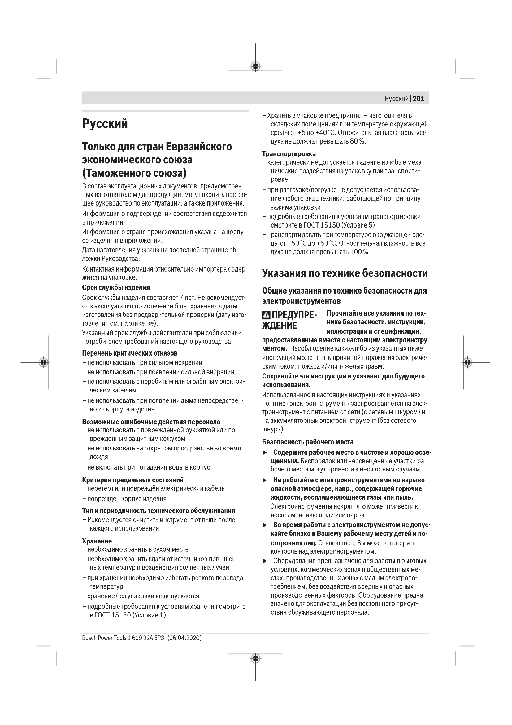 Toлько для стран Евразийского экономического союза (Таможенного союза) В состав эксплуатационных документов, предусмотрен- ных изготовителем для продукции, могут входить настоя- щее руководство по эксплуатации, а также приложения. Информация о подтверждении соответствия содержится в приложении. Информация о стране происхождения указана на корпу- се изделия и в приложении. Дата изготовления указана на последней странице об- ложки Руководства. Контактная информация относительно импортера содер- жится на упаковке. Срок службы изделия Срок службы изделия составляет 7 лет. Не рекомендует- ся к эксплуатации по истечении 5 лет хранения с даты изготовления без предварительной проверки (дату изго- товления см. на этикетке). Указанный срок службы действителен при соблюдении потребителем требований настоящего руководства. Перечень критических отказов – не использовать при сильном искрении – не использовать при появлении сильной вибрации – не использовать с перебитым или оголённым электри- ческим кабелем – не использовать при появлении дыма непосредствен- но из корпуса изделия Возможные ошибочные действия персонала – не использовать с поврежденной рукояткой или по- врежденным защитным кожухом – не использовать на открытом пространстве во время