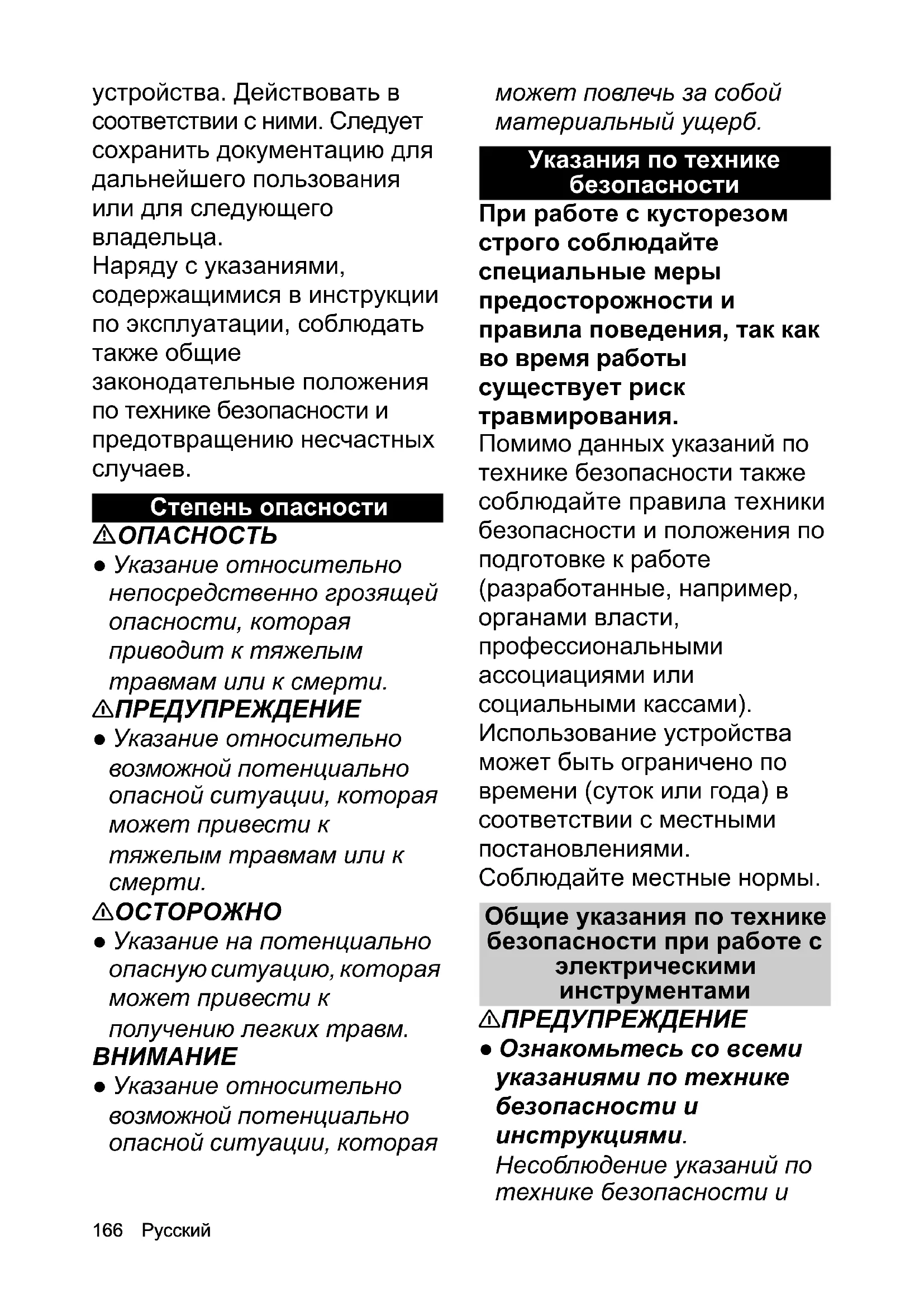 ● Указание относительно возможной потенциально опасной ситуации, которая может повлечь за собой материальный ущерб. Указания по технике безопасности При работе с кусторезом строго соблюдайте специальные меры предосторожности и правила поведения, так как во время работы существует риск травмирования. Помимо данных указаний по технике безопасности также соблюдайте правила техники безопасности и положения по подготовке к работе (разработанные, например, органами власти, профессиональными ассоциациями или социальными кассами). Использование устройства может быть ограничено по времени (суток или года) в соответствии с местными постановлениями. Соблюдайте местные нормы. Общие указания по технике безопасности при работе с электрическими инструментами 몇 ПРЕДУПРЕЖДЕНИЕ ● Ознакомьтесь со всеми указаниями по технике безопасности и инструкциями. Несоблюдение указаний по технике безопасности иРусский 167 инструкций может привести к поражению электрическим током и/или получению серьезных травм. Сохраняйте все указания по технике безопасности и инструкции для дальнейшего использования.