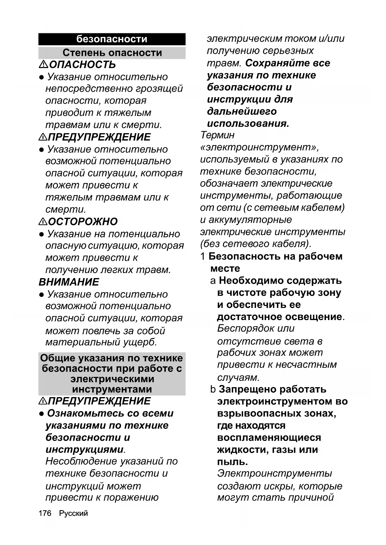 Электроинструменты создают искры, которые могут стать причинойРусский 177 воспламенения пыли или