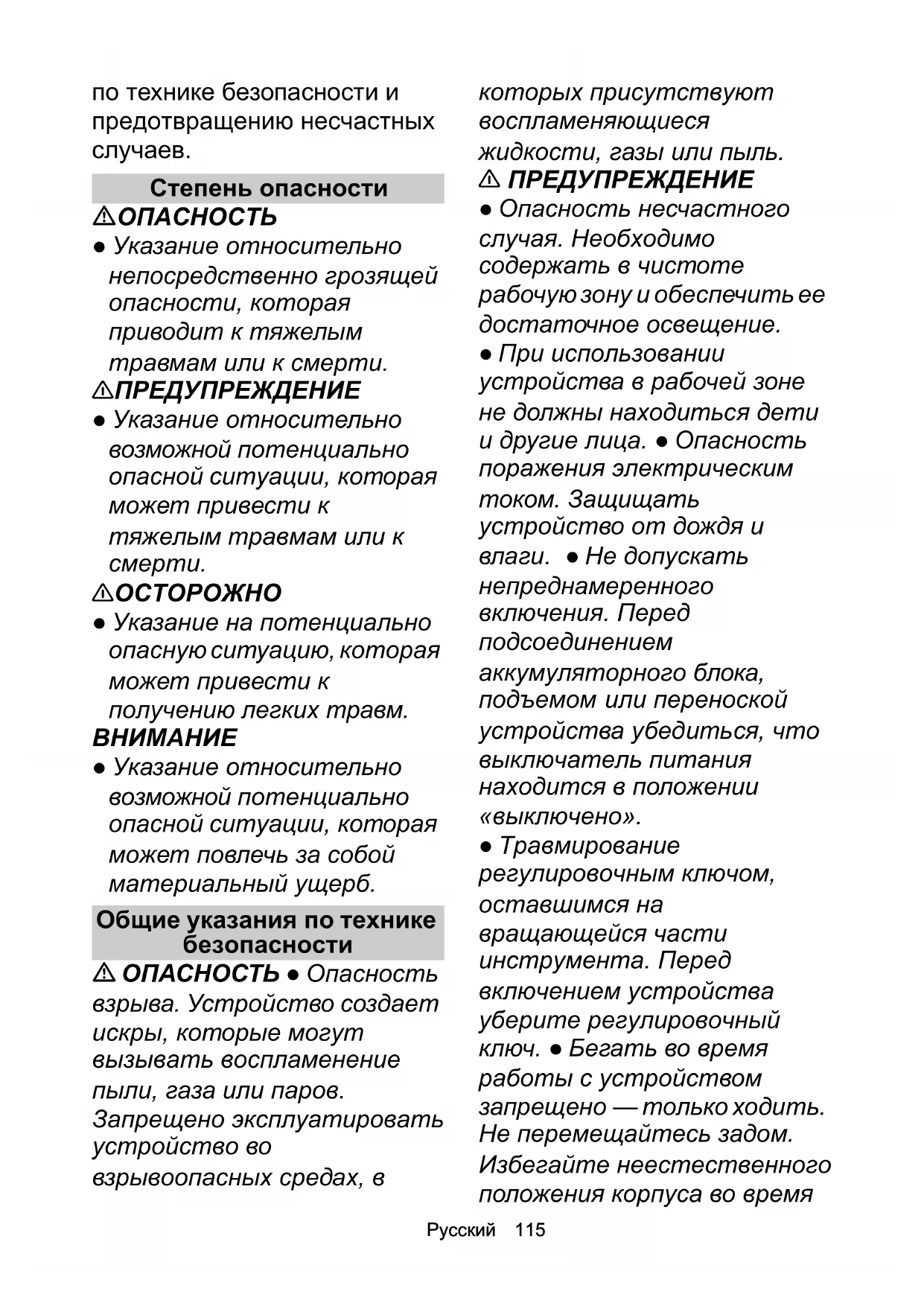 ● Указание относительно возможной потенциально опасной ситуации, которая может повлечь за собой материальный ущерб. Общие указания по технике безопасности ОПАСНОСТЬ ● Опасность взрыва. Устройство создает искры, которые могут вызывать воспламенение пыли, газа или паров. Запрещено эксплуатировать устройство во взрывоопасных средах, в которых присутствуют воспламеняющиеся жидкости, газы или пыль.