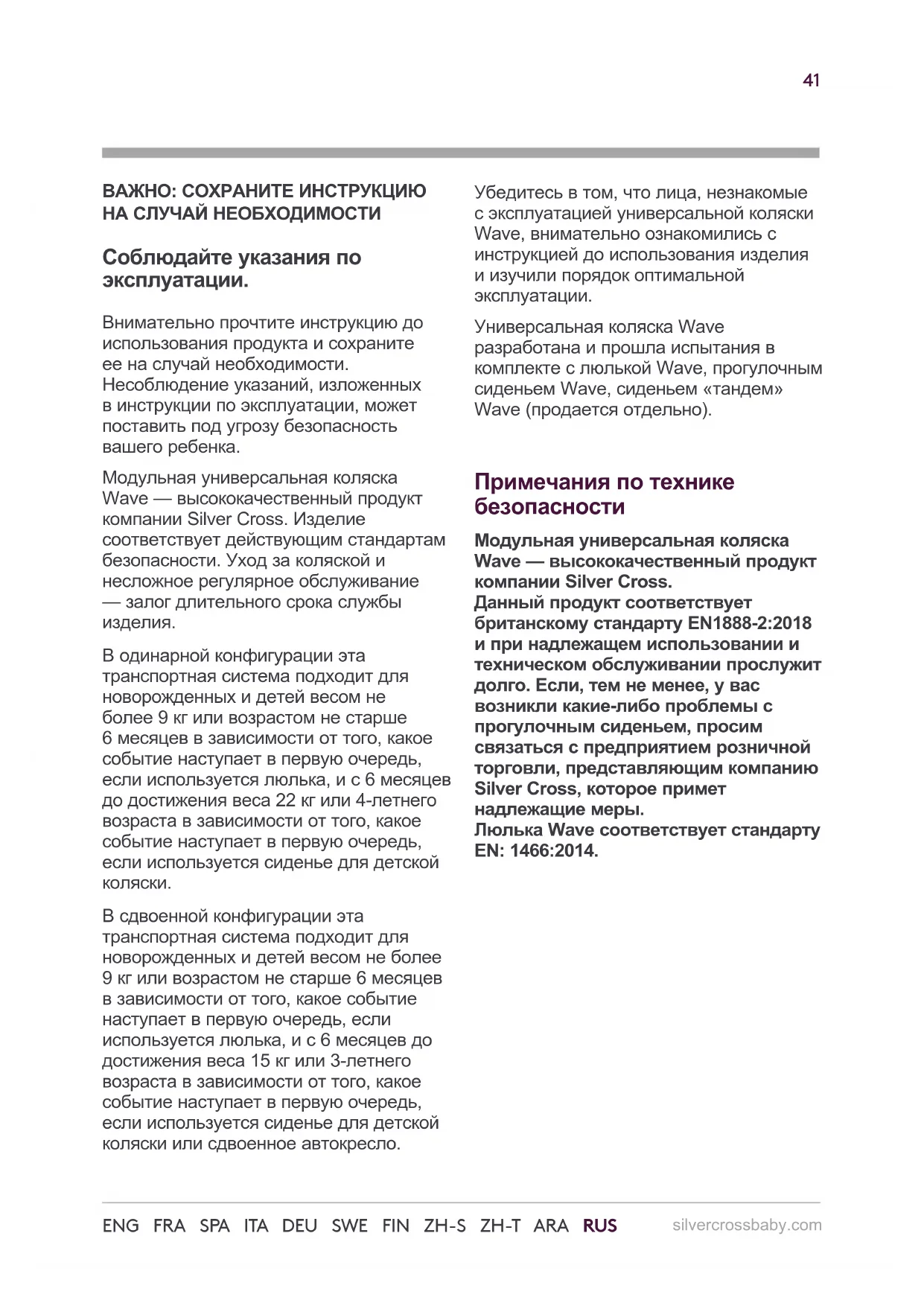 В сдвоенной конфигурации эта транспортная система подходит для новорожденных и детей весом не более 9 кг или возрастом не старше 6 месяцев в зависимости от того, какое событие наступает в первую очередь, если используется люлька, и с 6 месяцев до достижения веса 15 кг или 3-летнего возраста в зависимости от того, какое событие наступает в первую очередь, если используется сиденье для детской коляски или сдвоенное автокресло. Убедитесь в том, что лица, незнакомые с эксплуатацией универсальной коляски Wave, внимательно ознакомились с инструкцией до использования изделия и изучили порядок оптимальной эксплуатации. Универсальная коляска Wave разработана и прошла испытания в комплекте с люлькой Wave, прогулочным сиденьем Wave, сиденьем »тандем« Wave )продается отдельно(. Примечания по технике безопасности Модульная универсальная коляска Wave — высококачественный продукт компании Silver Cross. Данный продукт соответствует британскому стандарту EN1888-2:2018 и при надлежащем использовании и техническом обслуживании прослужит долго. Если, тем не менее, у вас возникли какие-либо проблемы с прогулочным сиденьем, просим связаться с предприятием розничной торговли, представляющим компанию Silver Cross, которое примет надлежащие меры. Люлька Wave соответствует стандарту EN: 1466:2014.42 ENG FRA SPA ITA DEU SWE FIN ZH-S ZH-T ARA RUS ПРЕДУПРЕЖДЕНИЯ: НИКОГДА НЕ ОСТАВЛЯЙТЕ РЕБЕНКА БЕЗ ПРИСМОТРА. ПЕРЕД ИСПОЛЬЗОВАНИЕМ УБЕДИТЕСЬ В ТОМ, ЧТО ВСЕ МЕХАНИЗМЫ БЛОКИРОВКИ ЗАДЕЙСТВОВАНЫ. ВО ИЗБЕЖАНИЕ ПРИЧИНЕНИЯ ТЕЛЕСНЫХ ПОВРЕЖДЕНИЙ УДОСТОВЕРЬТЕСЬ В ТОМ, ЧТО ПРИ СКЛАДЫВАНИИ И РАСКЛАДЫВАНИИ ИЗДЕЛИЯ РЕБЕНОК НАХОДИТСЯ НА БЕЗОПАСНОМ РАССТОЯНИИ. НЕ ПОЗВОЛЯЙТЕ РЕБЕНКУ ИГРАТЬ С ИЗДЕЛИЕМ. ПРОГУЛОЧНОЕ СИДЕНЬЕ И СИДЕНЬЕ «ТАНДЕМ» НЕ ПРЕДНАЗНАЧЕНЫ ДЛЯ ДЕТЕЙ МЛАДШЕ 6 МЕСЯЦЕВ. ВСЕГДА ИСПОЛЬЗУЙТЕ РЕМНИ БЕЗОПАСНОСТИ. ЗАПРЕЩАЕТСЯ ПЕРЕВОЗИТЬ В ПРОГУЛОЧНОЙ КОЛЯСКЕ БОЛЕЕ ДВУХ
