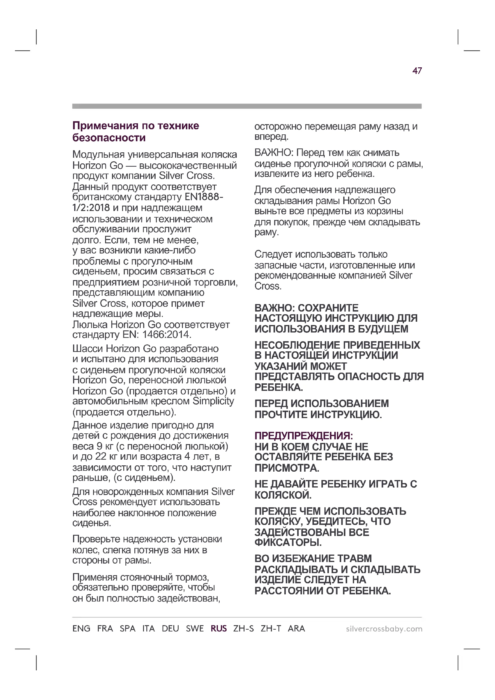 АВТОМОБИЛЬНОЕ КРЕСЛО SIMPLICITY НЕОБХОДИМО УСТАНАВЛИВАТЬ ПРОТИВ НАПРАВЛЕНИЯ ДВИЖЕНИЯ. ПЕРЕД ИСПОЛЬЗОВАНИЕМ АВТОМОБИЛЬНОГО КРЕСЛА SIMPLICITY НЕОБХОДИМО УБЕДИТЬСЯ В ПРАВИЛЬНОСТИ И НАДЕЖНОСТИ ЕГО КРЕПЛЕНИЯ.49 silvercrossbaby.com ENG FRA SPA ITA DEU SWE RUS ZH-S ZH-T ARA ДАННОЕ АВТОМОБИЛЬНОЕ КРЕСЛО НЕ ЗАМЕНЯЕТ ЛЮЛЬКИ ИЛИ КРОВАТКИ. УКЛАДЫВАТЬ СПАТЬ РЕБЕНКА НЕОБХОДИМО В ЛЮЛЬКУ ДЛЯ КОЛЯСКИ ИЛИ ОБЫЧНУЮ ЛЮЛЬКУ. ЕСЛИ АВТОМОБИЛЬНОЕ КРЕСЛО SIMPLICITY НЕ ИСПОЛЬЗУЕТСЯ СОВМЕСТНО С РАМОЙ HORIZON GO, УСТАНАВЛИВАЙТЕ ЕГО ТОЛЬКО НА УСТОЙЧИВУЮ, ГОРИЗОНТАЛЬНУЮ И СУХУЮ ПОВЕРХНОСТЬ. СКЛАДЫВАЯ И РАСКЛАДЫВАЯ РАМУ, НЕОБХОДИМО ПРОЯВЛЯТЬ ДОЛЖНУЮ ОСТОРОЖНОСТЬ. ОБЕСПЕЧЬТЕ, ЧТОБЫ СКЛАДЫВАЮЩИЕ МЕХАНИЗМЫ БЫЛИ СВОБОДНЫ, ВО ИЗБЕЖАНИЕ ЗАЩЕМЛЕНИЯ ПАЛЬЦЕВ ИЛИ ТРАВМИРОВАНИЯ КАКИХ-ЛИБО ЧАСТЕЙ ТЕЛА. ПЕРЕД ТЕМ КАК СКЛАДЫВАТЬ РАМУ HORIZON GO, НЕОБХОДИМО СНЯТЬ АДАПТЕРЫ АВТОМОБИЛЬНОГО КРЕСЛА SIMPLICITY ВО ИЗБЕЖАНИЕ ПОВРЕЖДЕНИЯ ИЗДЕЛИЙ. ВО ИЗБЕЖАНИЕ ВОЗМОЖНЫХ ТРАВМ ИЛИ ПОВРЕЖДЕНИЙ, ПРЕЖДЕ ЧЕМ ПОДНИМАТЬ И ПЕРЕНОСИТЬ РАМУ, ОБЯЗАТЕЛЬНО ПРОВЕРЯЙТЕ, ЗАДЕЙСТВОВАН ЛИ ФИКСАТОР СЛОЖЕННОГО ПОЛОЖЕНИЯ. СЛОЖЕННУЮ РАМУ ПЕРЕНОСИТЕ ЗА ГЛАВНУЮ РУЧКУ. ВЕЩИ, ВИСЯЩИЕ НА РУЧКЕ И/ ИЛИ НА ОБРАТНОЙ СТОРОНЕ СПИНКИ И/ИЛИ БОКАХ КОЛЯСКИ, СНИЖАЮТ ЕЕ УСТОЙЧИВОСТЬ. ПРЕДУПРЕЖДЕНИЯ ОТНОСИТЕЛЬНО ЭКСПЛУАТАЦИИ ЛЮЛЬКИ: ЭТОТ ПРОДУКТ ПРЕДНАЗНАЧЕН ДЛЯ ДЕТЕЙ, НЕ УМЕЮЩИХ СИДЕТЬ САМОСТОЯТЕЛЬНО. ИСПОЛЬЗУЙТЕ ПРОДУКТ ТОЛЬКО НА ТВЕРДОЙ ГОРИЗОНТАЛЬНОЙ СУХОЙ ПОВЕРХНОСТИ. НЕ ПОЗВОЛЯЙТЕ ДРУГИМ ДЕТЯМ ИГРАТЬ ВОЗЛЕ ЛЮЛЬКИ БЕЗ