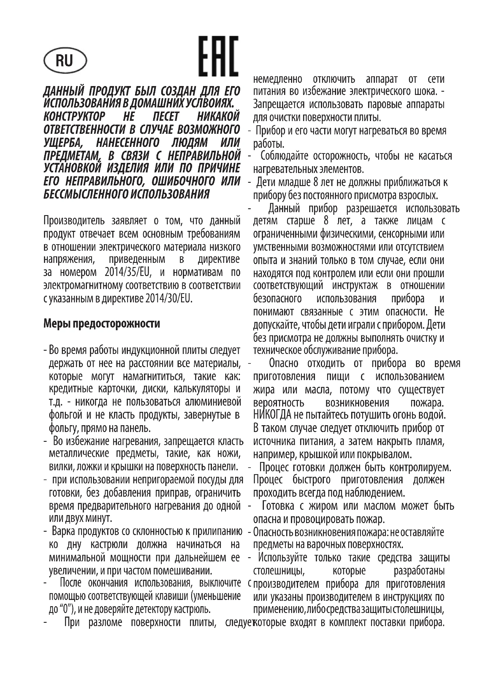 - Соблюдайте осторожность, чтобы не касаться нагревательных элементов. - Дети младше 8 лет не должны приближаться к прибору без постоянного присмотра взрослых. - Данный прибор разрешается использовать детям старше 8 лет, а также лицам с ограниченными физическими, сенсорными или умственными возможностями или отсутствием опыта и знаний только в том случае, если они находятся под контролем или если они прошли соответствующий инструктаж в отношении безопасного использования прибора и понимают связанные с этим опасности. Не допускайте, чтобы дети играли с прибором. Дети без присмотра не должны выполнять очистку и техническое обслуживание прибора. - Опасно отходить от прибора во время приготовления пищи с использованием жира или масла, потому что существует вероятность возникновения пожара. НИКОГДА не пытайтесь потушить огонь водой. В таком случае следует отключить прибор от источника питания, а затем накрыть пламя, например, крышкой или покрывалом. - Процес готовки должен быть контролируем. Процес быстрого приготовления должен проходить всегда под наблюдением. - Готовка с жиром или маслом может быть опасна и провоцировать пожар. - Опасность возникновения пожара: не оставляйте предметы на варочных поверхностях. - Используйте только такие средства защиты столешницы, которые разработаны производителем прибора для приготовления или указаны производителем в инструкциях по применению, либо средства защиты столешницы, которые входят в комплект поставки прибора. RUИспользование неподходящих средств защиты может привести к возникновению несчастных