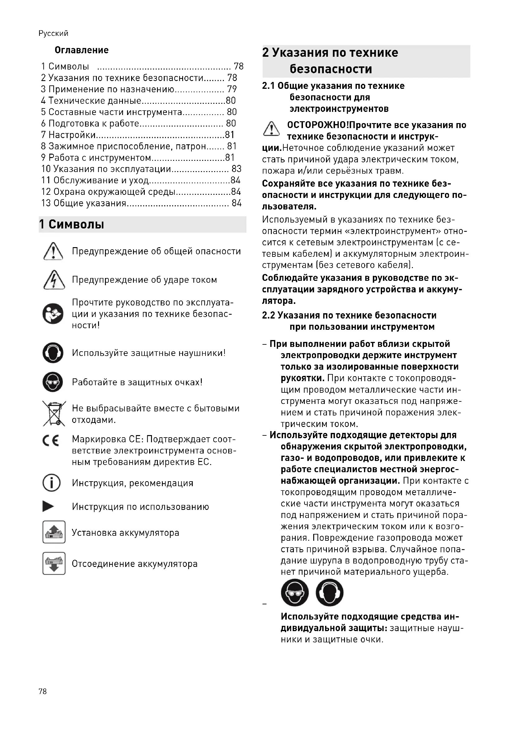 Маркировка CE: Подтверждает соот ветствие электроинструмента основ ным требованиям директив ЕС. Инструкция, рекомендация Инструкция по использованию Установка аккумулятора Отсоединение аккумулятора 2 Указания по технике безопасности