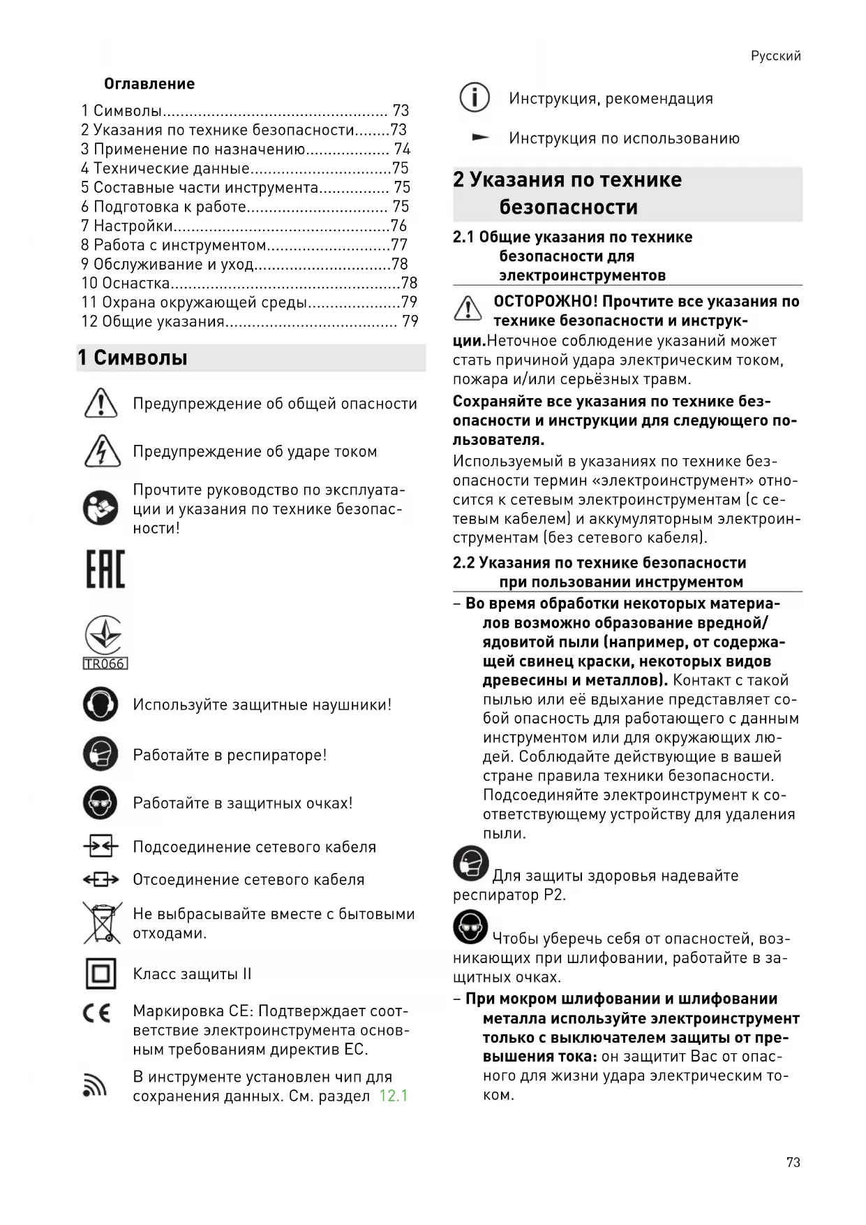 Класс защиты II Маркировка CE: Подтверждает соот ветствие электроинструмента основ ным требованиям директив ЕС. В инструменте установлен чип для сохранения данных. См. раздел 12.1 Инструкция, рекомендация Инструкция по использованию 2 Указания по технике безопасности