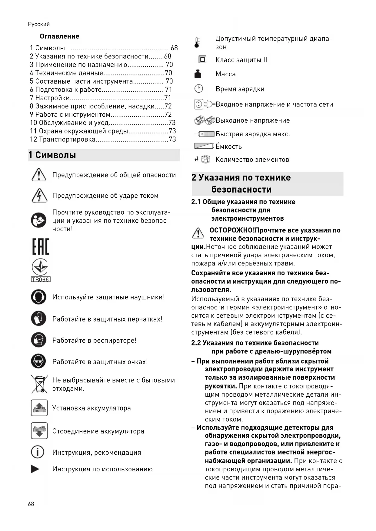 Прочтите все указания по технике безопасности и инструк ции.Неточное соблюдение указаний может стать причиной удара электрическим током, пожара и/или серьёзных травм. Сохраняйте все указания по технике без опасности и инструкции для следующего по льзователя. Используемый в указаниях по технике без опасности термин «электроинструмент» отно сится к сетевым электроинструментам (с се тевым кабелем) и аккумуляторным электроин струментам (без сетевого кабеля).