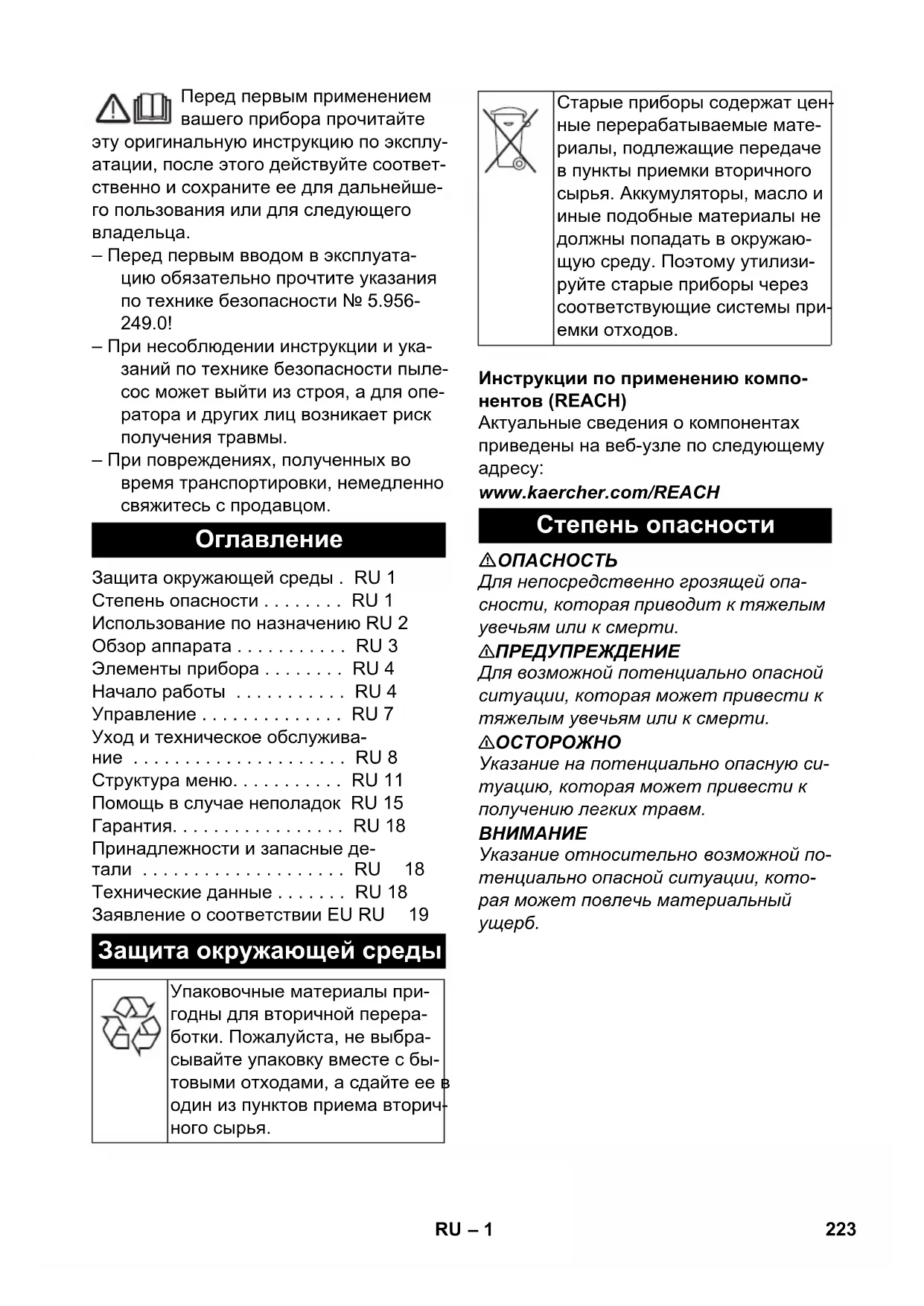 Защита окружающей среды . RU 1 Степень опасности . . . . . . . . RU 1 Использование по назначению RU 2 Обзор аппарата . . . . . . . . . . . RU 3 Элементы прибора . . . . . . . . RU 4 Начало работы . . . . . . . . . . . RU 4 Управление . . . . . . . . . . . . . . RU 7 Уход и техническое обслужива- ние . . . . . . . . . . . . . . . . . . . . . RU 8 Структура меню. . . . . . . . . . . RU 11 Помощь в случае неполадок RU 15 Гарантия. . . . . . . . . . . . . . . . . RU 18 Принадлежности и запасные де- тали . . . . . . . . . . . . . . . . . . . . RU 18 Технические данные . . . . . . . RU 18 Заявление о соответствии ЕU RU 19 Защита окружающей среды Упаковочные материалы при- годны для вторичной перера- ботки. Пожалуйста, не выбра- сывайте упаковку вместе с бы- товыми отходами, а сдайте ее в один из пунктов приема вторич- ного сырья. Старые приборы содержат цен- ные перерабатываемые мате- риалы, подлежащие передаче в пункты приемки вторичного сырья. Аккумуляторы, масло и иные подобные материалы не должны попадать в окружаю- щую среду. Поэтому утилизи- руйте старые приборы через соответствующие системы при- емки отходов. Степень опасности 223RU– 2 Указание: Компания Kärcher не несет никакой ответственности за поврежде- ния прибора, повреждения автомобиля клиента, который необходимо почи- стить, а также за другие повреждения, которые возникли в результате несо- блюдения положений настоящего руко- водства по эксплуатации. – Прибор предназначен для сбора су- хих загрязнений в салоне транспор- тных средств. – Использованием не по назначению считается сбор горючих материалов, вредной для здоровья пыли и жидко- стей и поэтому данное использова- ние запрещается. – Данный прибор пригоден для про- мышленного применения. – Доступен одноместный (SB VC 1) или двухместный (SB VC 2) вариант. Использование по