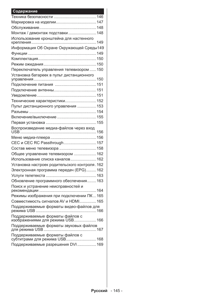 Содержание Техника безопасности146 Маркировка на изделии147 Обслуживание148 Монтаж / демонтаж подставки148 Использование кронштейна для настенного крепления149 Информация Об Охране Окружающей Среды.149 Функции149 Комплектация150 Режим ожидания150 Переключатель управления телевизором150 Установка батареек в пульт дистанционного управления150 Подключение питания 151 Подключение антенны151 Уведомление151 Технические характеристики152 Пульт дистанционного управления153 Разъемы154 Включение/выключение155 Первая установка155 Воспроизведение медиа-файлов через вход USB156 Меню медиа-плеера156 CEC и CEC RC Passthrough157 Состав меню телевизора158 Общее управление телевизором162 Использование списка каналов162 Установка настроек родительского контроля..162 Электронная программа передач (EPG)162 Услуги телетекста163 Обновление программного обеспечения163 Поиск и устранение неисправностей и рекомендации164 Режимы изображения при подключении ПК....165 Совместимость сигналов AV и HDMI165 Поддерживаемые форматы видео-файлов для режима USB166 Поддерживаемые форматы файлов с изображениями для режима USB166 Поддерживаемые форматы звуковых файлов для режима USB167 Поддерживаемые форматы файлов с субтитрами для режима USB168 Поддерживаемые разрешения DVI169