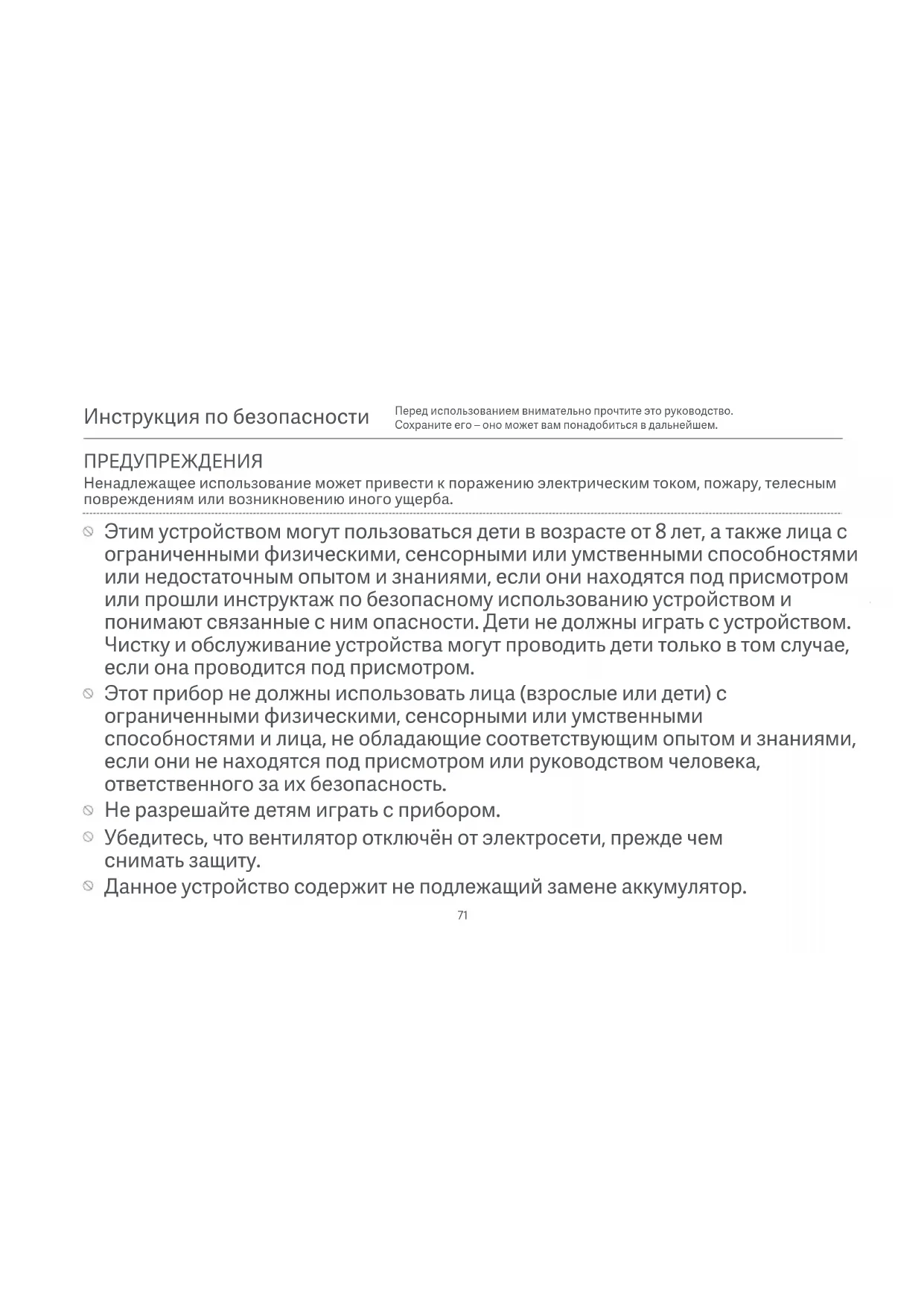 Этим устройством могут пользоваться дети в возрасте от 8 лет, а также лица с ограниченными физическими, сенсорными или умственными способностями или недостаточным опытом и знаниями, если они находятся под присмотром или прошли инструктаж по безопасному использованию устройством и понимают связанные с ним опасности. Дети не должны играть с устройством. Чистку и обслуживание устройства могут проводить дети только в том случае, если она проводится под присмотром. Этот прибор не должны использовать лица (взрослые или дети) с ограниченными физическими, сенсорными или умственными способностями и лица, не обладающие соответствующим опытом и знаниями, если они не находятся под присмотром или руководством человека, ответственного за их безопасность. Не разрешайте детям играть с прибором. Убедитесь, что вентилятор отключён от электросети, прежде чем снимать защиту. Данное устройство содержит неподлежащий замене аккумулятор. Ненадлежащее использование может привести к поражению электрическим током, пожару, телесным повреждениям или возникновению иного ущерба. ПРЕДУПРЕЖДЕНИЯПРЕДУПРЕЖДЕНИЕ: Для зарядки батареи используйте только съемный блок питания <BLJ24W120200P-V>, поставляемый с этим устройством. При обычных условиях использования, между вентилятором и телом пользователя должно сохраняться расстояние не менее 20см. Это устройство содержит встроенный литий-ионный аккумулятор. Не разбирайте, не ударяйте, не разбивайте аккумулятор и не бросайте его в огонь. При сильном вздутии аккумулятора, прекратите использование. Не оставляйте аккумулятор в местах с высокой температурой окружающей