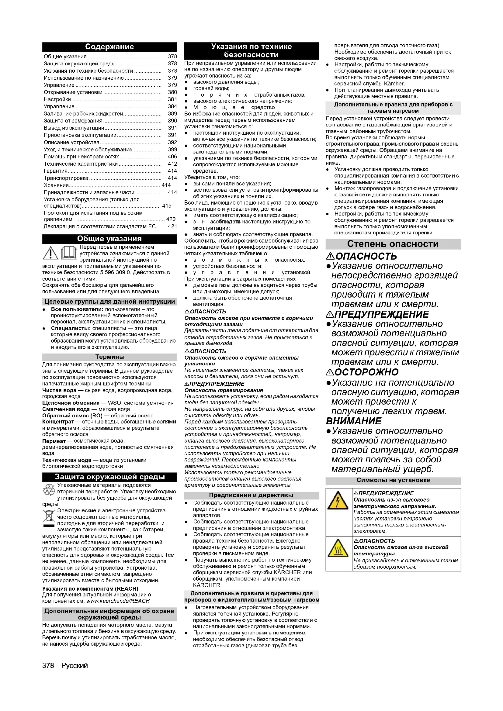 менее, данные компоненты необходимы для правильной работы устройства. Устройства, обозначенные этим символом, запрещено утилизировать вместе с бытовыми отходами. Указания по компонентам (REACH) Для получения актуальной информации о компонентах см. www.kaercher.de/REACH Дополнительная информация об охране окружающей среды Не допускать попадания моторного масла, мазута, дизельного топлива и бензина в окружающую среду. Беречь почву и утилизировать отработанное масло, не нанося ущерба окружающей среде. Указания по технике безопасности При неправильном управлении или использовании не по назначению оператору и другим людям угрожает опасность из-за: ● высокого давления воды; ● горячей воды; ●горячих отработанных газов; ● высокого электрического напряжения; ●Моющее средство Во избежание опасностей для людей, животных и имущества перед первым использованием установки ознакомиться с: ● настоящей инструкцией по эксплуатации, включая все указания по технике безопасности; ● соответствующими национальными законодательными нормами; ●указаниями по технике безопасности, которыми сопровождаются используемые моющие