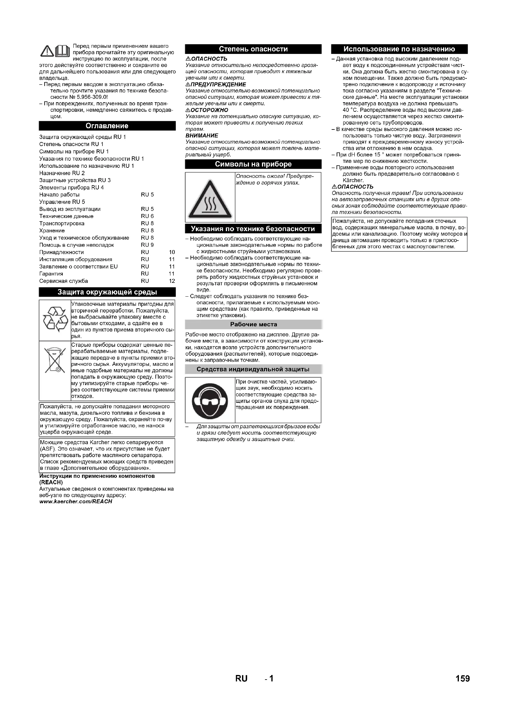 162 RU- 5 Опасность травмы! Прибор, подводы, шланг высо- кого давления и подключения должны находиться в безупречном состоянии. Если состояние не явля- ется исправным, то устройство использовать Пользователь должен использовать прибор в со- ответствии с назначением. Он должен учиты- вать местные особенности и обращать внимание при работе с прибором на других лиц , находящихся поблизости. Запрещается оставлять работающий прибор без присмотра. ОПАСНОСТЬ – Опасность обваривания горячей водой! Не на- правлять шланг на людей или животных. – Опасность ожогов о горячие элементы установ- ки! При работе с горячей водой не прикасайтесь к неизолированным трубопроводам и шлангам. Струйную трубку удерживать только за чашку рукоятки.– Опасность отравления или химического ожога моющими средствами! Принять во внимание ука- зания, приведенные на упаковке моющего средст- ва. Сохранять моющее средство в месте, недо- ступном для неуполномоченных лиц. Опасность поражения током!Не направляйте струю воды на следующие устройства: – электрические приборы и установки, – на собственно эту установку, – на все токоведущие детали в рабочей зоне.Из-за струи воды, выходящей из струйной трубки, возникает сила отдачи. Из-за того, что струйная трубка расположена под углом, сила действует вверх. ОПАСНОСТЬ – Опасность получения травм! Сила отдачи струйной трубки может нарушить ваше рав- новесие. Вы можете упасть. Струйная труб- ка может вылететь и травмировать окружа- ющих людей. Выберите удобную позицию для работы и крепко удерживайте ручной писто- лет-распылитель. Никогда не заклинивайте рычаг ручного пистолета-распылителя. – Не разрешается также направлять струю воды на других или себя для чистки одежды – Опасность получения травмы от отлетаю- щих частей! Отлетающие обломки или пред- меты могут травмировать людей или жи- вотных. Не направлять струю воды на бью- щиеся или незакрепленные предметы. – Опасность аварии вследствие повреждения! клапаны очистить с минимальным расстоянием 30 см. ОПАСНОСТЬ Опасность, вызванная опасными для здоровья ве- ществамиНе распылять следующие материалы, так как в воздух могут подняться опасные для здоровья вещества:– асбестосодержащие материалы, – материалы, которые, возможно, содержат опасные для здоровья вещества. – Опасность получения травмы от выходящей струи, возможно, горячей воды! Наиболее оп- тимальным образом к установке подходят только оригинальные шланги высокого давле- ния фирмы Karcher. При использовании других шлангов гарантия исключается. – Опасность для здоровья из-за применения мо- ющих средств! Из-за добавок, при необходимо- сти, моющего средства вода, слитая из при- бора, не соответствует качеству питьевой – Опасность повреждения органов слуха при боте с частями, усиливающими звук! В этом случае следует носить средства защиты ор- ганов слуха.몇 ПРЕДУПРЕЖДЕНИЕ Длительное использование устройства может привести к нарушению кровоснабжения рук. Невозможно указать конкретное время использова-ние аппарата, так как это зависит от нескольких факторов:– Личная предрасположенность к плохому крово-обращению (часто зябнущие пальцы, формика-ция пальцев).– Низкая внешняя температура. Для защиты рук носите теплые перчатки.– Прочная хватка препятствует кровообращению.– Непрерывная работа хуже, чем работа с пауз