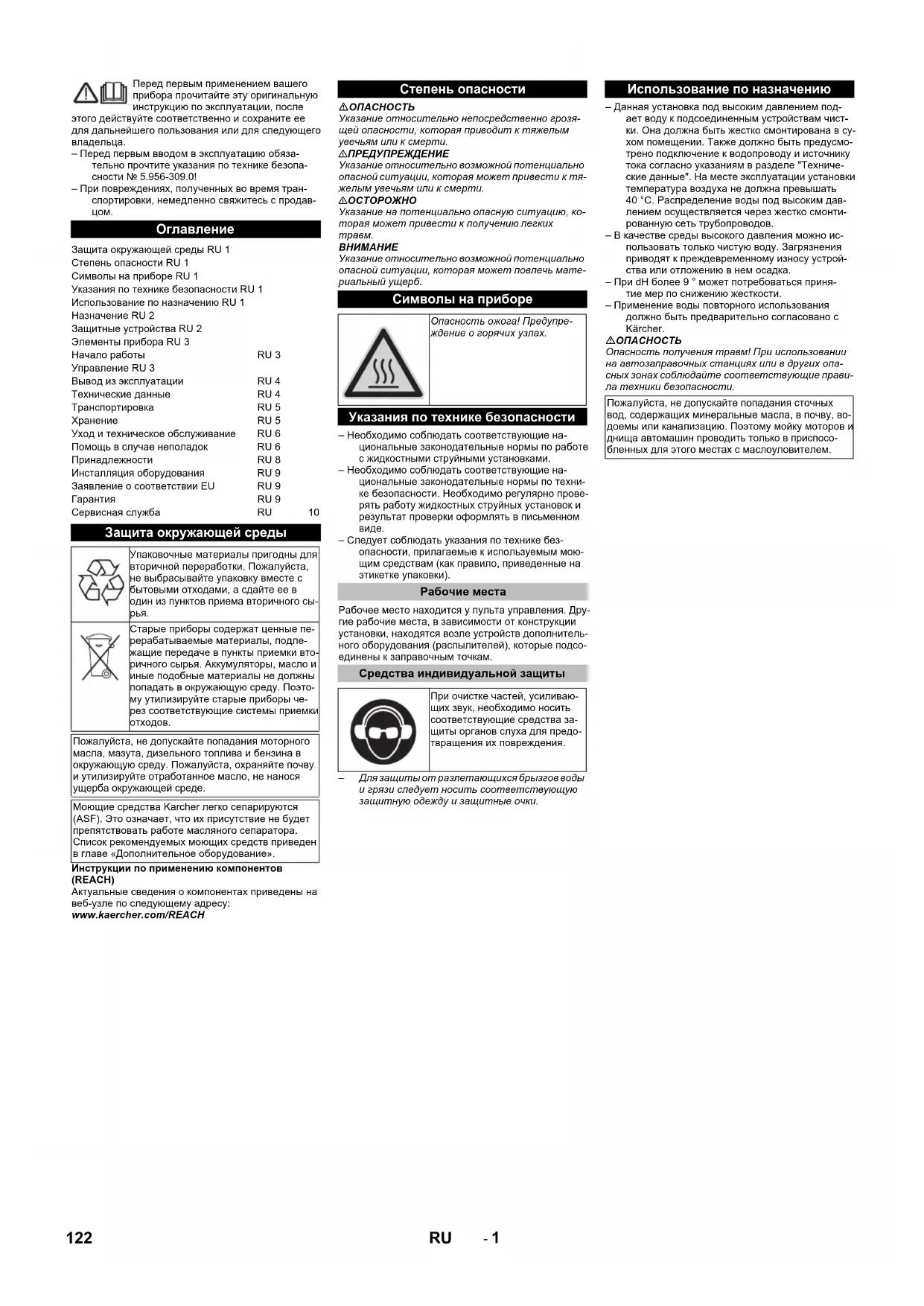 тимальным образом к установке подходят только оригинальные шланги высокого давле- ния фирмы Karcher. При использовании других шлангов гарантия исключается. – Опасность для здоровья из-за применения мою- щих средств! Из-за добавок, при необходимости, моющего средства вода, слитая из прибора, не соответствует качеству питьевой воды. – Опасность повреждения органов слуха при ра- боте с частями, усиливающими звук! В этом случае следует носить средства защиты ор- ганов слуха.몇 ПРЕДУПРЕЖДЕНИЕ Длительное использование устройства может привести к нарушению кровоснабжения рук. Невозможно указать конкретное время использова-ние аппарата, так как это зависит от нескольких факторов:– Личная предрасположенность к плохому крово-обращению (часто зябнущие пальцы, формика-ция пальцев).– Низкая внешняя температура. Для защиты рук носите теплые перчатки.– Прочная хватка препятствует кровообращению.– Непрерывная работа хуже, чем работа с паузами.При регулярном использовании прибора и повтор-ном появлении соответствующих признаков (напри-мер, формикации пальцев, зябнущие пальцы) мы рекомендуем пройти врачебное обследование. ОПАСНОСТЬ Опасность получения травмы от выходящей струи, возможно, горячей воды! Перед началом работы высоконапорный шланг не- обходимо всегда проверять на повреждения. По- врежденный высоконапорный шланг подлежит не- замедлительной замене. Перед каждым использованием проверяйте шланг высокого давления, трубопроводы, арма-туру и струйную трубку на предмет повреждений. Проверяйте места соединений шлангов на плотность посадки и герметичность. Повернуть главный переключатель в положе-ние "0". Закрыть подачу воды. Нажать рычаг пистолета-распылителя, пока ап-парат не освободится от давления. Откройте подачу воды. Повернуть главный переключатель в положе-ние "1". Нажать на клавишу разблокировки.Горит контрольная лампочка готовности к работе. Произвести очистку.Указание:При паузе во время чистки продолжи-тельностью более 30 секунд насос останавливает-ся. Одновременно устанавливается время подго-товки к работе продолжительностью 6 часов. При-бор автоматически достигает времени подготовки к работе при перепаде давления, возникающего вви-ду открытия ручного пистолета-распылителя. Нажать на клавишу разблокировки.Горит контрольная лампочка готовности к работе. Повернуть главный переключатель в положе-ние "0". Закрыть подачу воды. Нажать рычаг пистолета-распылителя, пока ап-парат не освободится от давления. Заблокировать пистолет-распылитель с помо-щью предохранительного фиксатора от случай-ного нажатия. При длительных перерывах в работе или при невоз-можности установки устройства в местах, защищен-ных от мороза, следует провести следующие меро-приятия (см. главу «Техническое обслуживание и уход», раздел «Защита от морозов»): Слить воду. Промывка прибора антифризом. Выключить и заблокировать главный выключа-тель.
