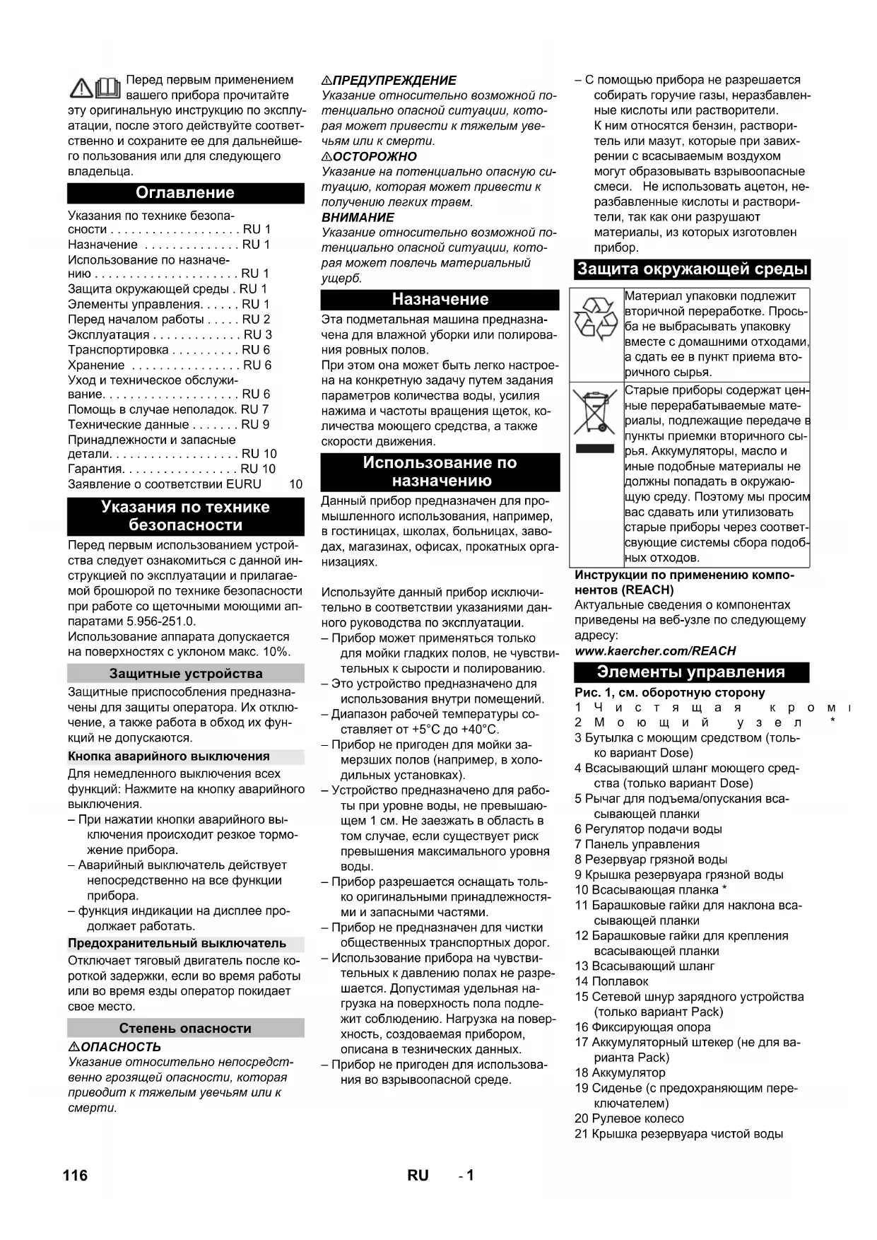 www.kaercher.com/REACH Рис. 1, см. оборотную сторону 1Чистящая кромка * 2Моющий узел * 3 Бутылка с моющим средством (толь- ко вариант Dose) 4 Всасывающий шланг моющего сред- ства (только вариант Dose) 5 Рычаг для подъема/опускания вса- сывающей планки 6 Регулятор подачи воды 7 Панель управления 8 Резервуар грязной воды 9 Крышка резервуара грязной воды 10 Всасывающая планка * 11 Барашковые гайки для наклона вса- сывающей планки 12 Барашковые гайки для крепления всасывающей планки 13 Всасывающий шланг 14 Поплавок 15 Сетевой шнур зарядного устройства (только вариант Pack) 16 Фиксирующая опора 17 Аккумуляторный штекер (не для ва- рианта Pack) 18 Аккумулятор 19 Сиденье (с предохраняющим пере- ключателем) 20 Рулевое колесо 21 Крышка резервуара чистой воды