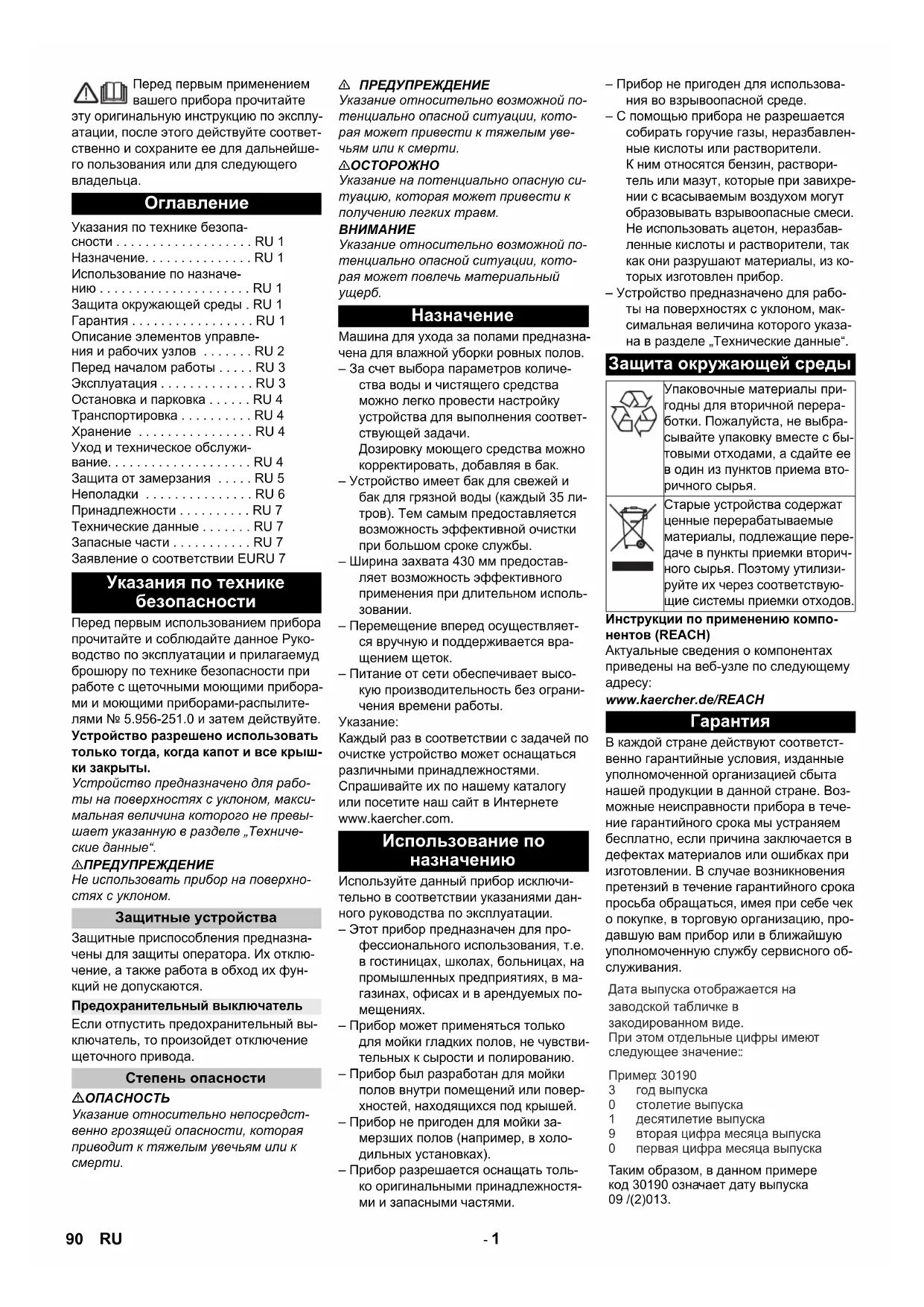 Указания по технике безопа- сности . . . . . . . . . . . . . . . . . . . RU 1 Назначение. . . . . . . . . . . . . . . RU 1 Использование по назначе- нию . . . . . . . . . . . . . . . . . . . . . RU 1 Защита окружающей среды . RU 1 Гарантия . . . . . . . . . . . . . . . . . RU 1 Описание элементов управле- ния и рабочих узлов . . . . . . . RU 2 Перед началом работы . . . . . RU 3 Эксплуатация . . . . . . . . . . . . . RU 3 Остановка и парковка . . . . . . RU 4 Транспортировка . . . . . . . . . . RU 4 Хранение . . . . . . . . . . . . . . . . RU 4 Уход и техническое обслужи- вание. . . . . . . . . . . . . . . . . . . . RU 4 Защита от замерзания . . . . . RU 5 Неполадки . . . . . . . . . . . . . . . RU 6 Принадлежности . . . . . . . . . . RU 7 Технические данные . . . . . . . RU 7 Запасные части . . . . . . . . . . . RU 7 Заявление о соответствии ЕURU 7 Указания по технике безопасности Защитные устройства Предохранительный выключатель Степень опасности
