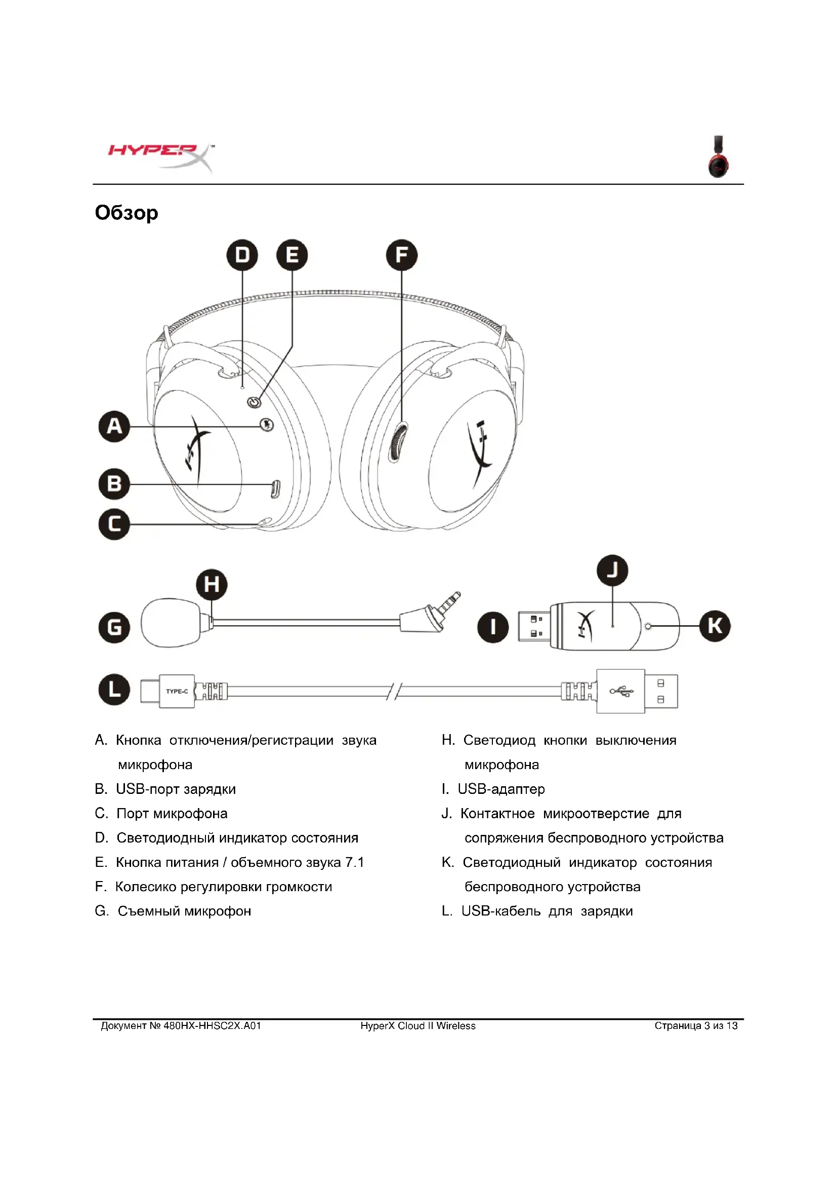 J. Контактное микроотверстие для сопряжения беспроводного устройства K. Светодиодный индикатор состояния беспроводного устройства L. USB-кабель для зарядкиДокумент № 480HX-HHSC2X.A01 HyperX Cloud II Wireless Страница 4 из 13