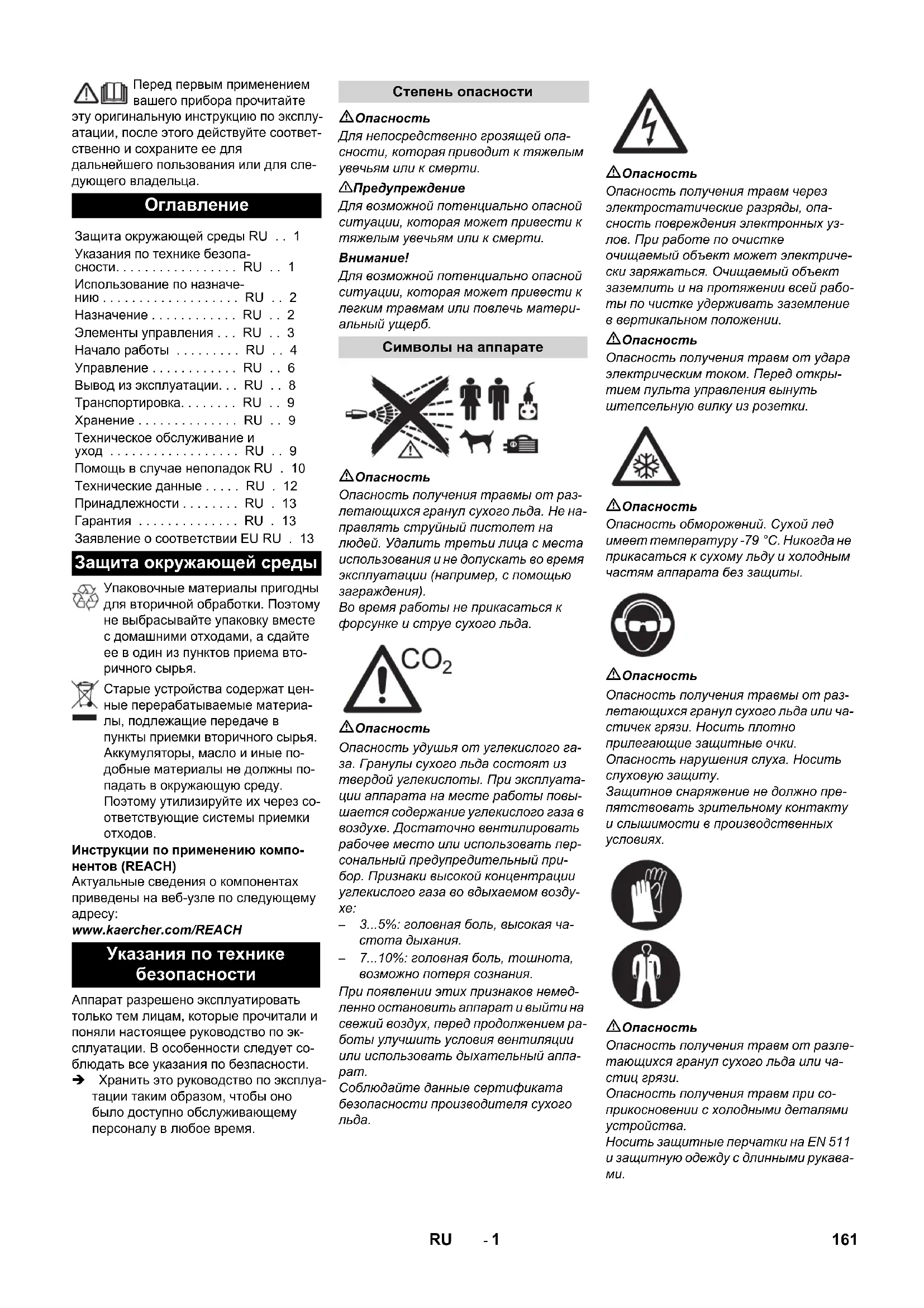 Защита окружающей среды RU . . 1 Указания по технике безопа- сности. . . . . . . . . . . . . . . . . RU . . 1 Использование по назначе- нию . . . . . . . . . . . . . . . . . . . RU . . 2 Назначение . . . . . . . . . . . . RU . . 2 Элементы управления . . . RU . . 3 Начало работы . . . . . . . . . RU . . 4 Управление . . . . . . . . . . . . RU . . 6 Вывод из эксплуатации. . . RU . . 8 Транспортировка. . . . . . . . RU . . 9 Хранение . . . . . . . . . . . . . . RU . . 9 Техническое обслуживание и уход . . . . . . . . . . . . . . . . . . RU . . 9 Помощь в случае неполадок RU . 10 Технические данные . . . . . RU . 12 Принадлежности . . . . . . . . RU . 13 Гарантия . . . . . . . . . . . . . . RU . 13 Заявление о соответствии ЕU RU . 13 Защита окружающей среды Указания по технике безопасности Степень опасности Символы на аппарате 161RU- 2