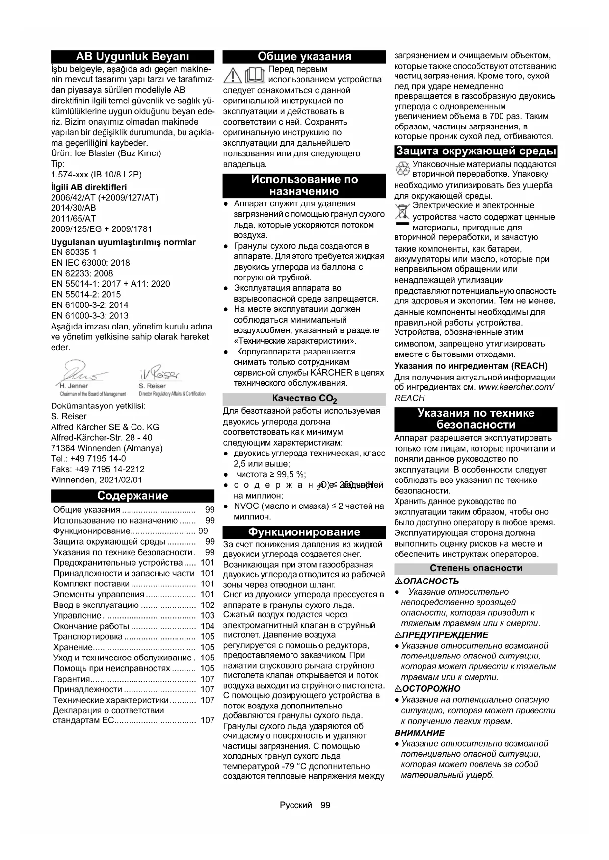 - Декларация о соответствии стандартам ЕС 00 Русский Символы на устройстве Опасность от разлетающихся гранул сухого льда. Не направлять струйный пистолет на людей. Удалить посторонних лиц из рабочей зоны и исключить их доступ в рабочую зону во время эксплуатации (например, установив ограждения). Во время эксплуатации исключить контакт с соплом и струей сухого льда. Опасность удушья двуокисью углерода. Во время эксплуатации содержание двуокиси углерода в воздухе на рабочем месте увеличивается. Обеспечить достаточный воздухообмен на рабочем месте. Проложить отводной шланг, например, с выводом наружу, чтобы исключить опасность удушья двуокисью углерода. Примечание: двуокись углерода тяжелее воздуха. Следить за тем, чтобы двуокись углерода не попала, например, снаружи в подвал под мастерской. При более длительной струйной очистке (более 10 минут в день), особенно в небольших помещениях (менее 300 м³), рекомендуется использовать устройство предупреждения о повышенном содержании двуокиси углерода в p. 1071