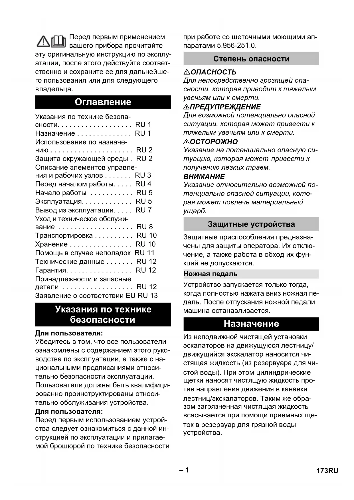 Указания по технике безопа- сности. . . . . . . . . . . . . . . . . . . RU 1 Назначение . . . . . . . . . . . . . . RU 1 Использование по назначе- нию . . . . . . . . . . . . . . . . . . . . . RU 2 Защита окружающей среды . RU 2 Описание элементов управле- ния и рабочих узлов . . . . . . . RU 3 Перед началом работы. . . . . RU 4 Начало работы . . . . . . . . . . . RU 5 Эксплуатация. . . . . . . . . . . . . RU 5 Вывод из эксплуатации. . . . . RU 7 Уход и техническое обслужи- вание . . . . . . . . . . . . . . . . . . . RU 8 Транспортировка . . . . . . . . . . RU 10 Хранение . . . . . . . . . . . . . . . . RU 10 Помощь в случае неполадок RU 11 Технические данные . . . . . . . RU 12 Гарантия. . . . . . . . . . . . . . . . . RU 12 Принадлежности и запасные детали . . . . . . . . . . . . . . . . . . RU 12 Заявление о соответствии ЕU RU 13 Указания по технике безопасности Степень опасности Защитные устройства Ножная педаль