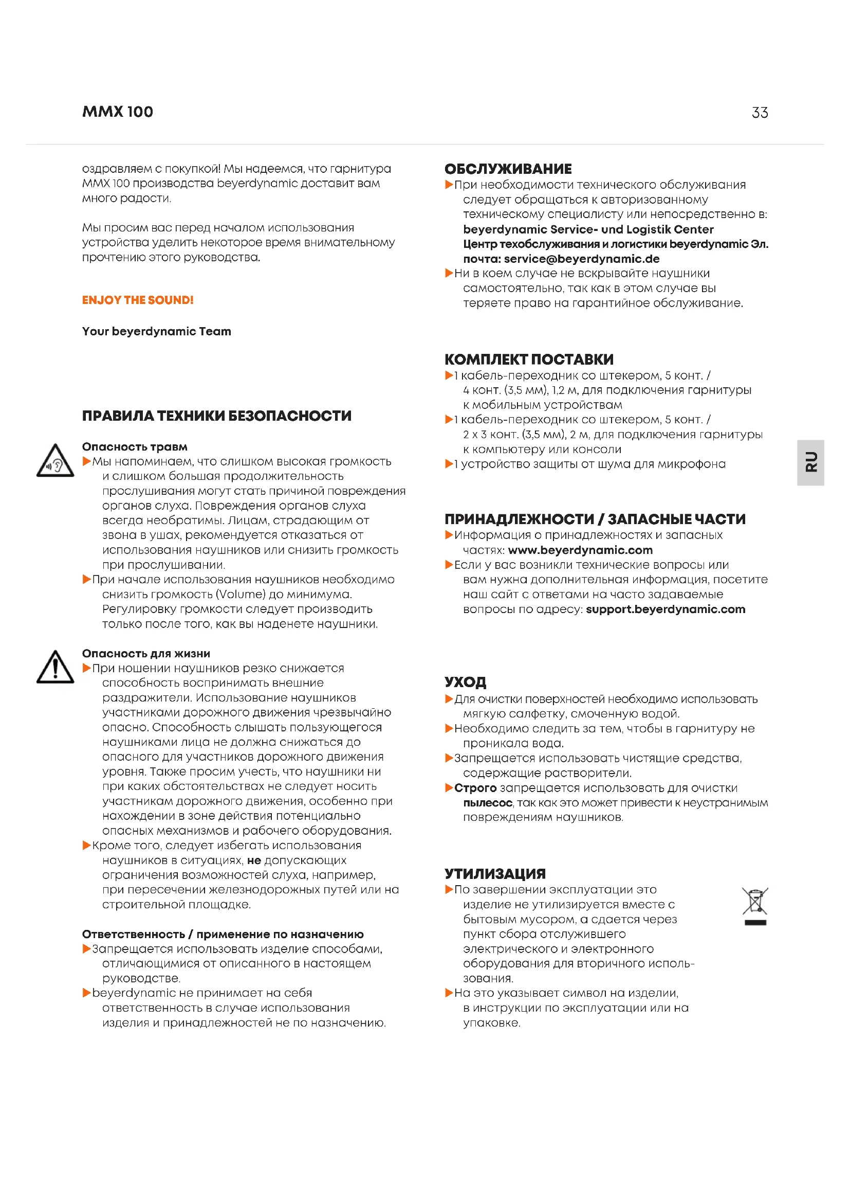 ПРИНАДЛЕЖНОСТИ / ЗАПАСНЫЕ ЧАСТИ u Информация о принадлежностях и запасных частях: www.beyerdynamic.com u Если у вас возникли технические вопросы или вам нужна дополнительная информация, посетите наш сайт с ответами на часто задаваемые вопросы по адресу: suppo.beyerdynamic.com КОМПЛЕКТ ПОСТАВКИ u 1 кабель-переходник со штекером, 5 конт. / 4 конт. (3,5 мм), 1,2 м, для подключения гарнитуры к мобильным устройствам u 1 кабель-переходник со штекером, 5 конт. / 2 х 3 конт. (3,5 мм), 2 м, для подключения гарнитуры к компьютеру или консоли u 1 устройство защиты от шума для микрофона ОБСЛУЖИВАНИЕ u При необходимости технического обслуживания следует обращаться к авторизованному техническому специалисту или непосредственно в: beyerdynamic Service- und Logistik Center Центр техобслуживания и логистики beyerdynamic Эл. почта: service@beyerdynamic.de u Ни в коем случае не вскрывайте наушники самостоятельно, так как в этом случае вы теряете право на гарантийное обслуживание.34 MMX 100