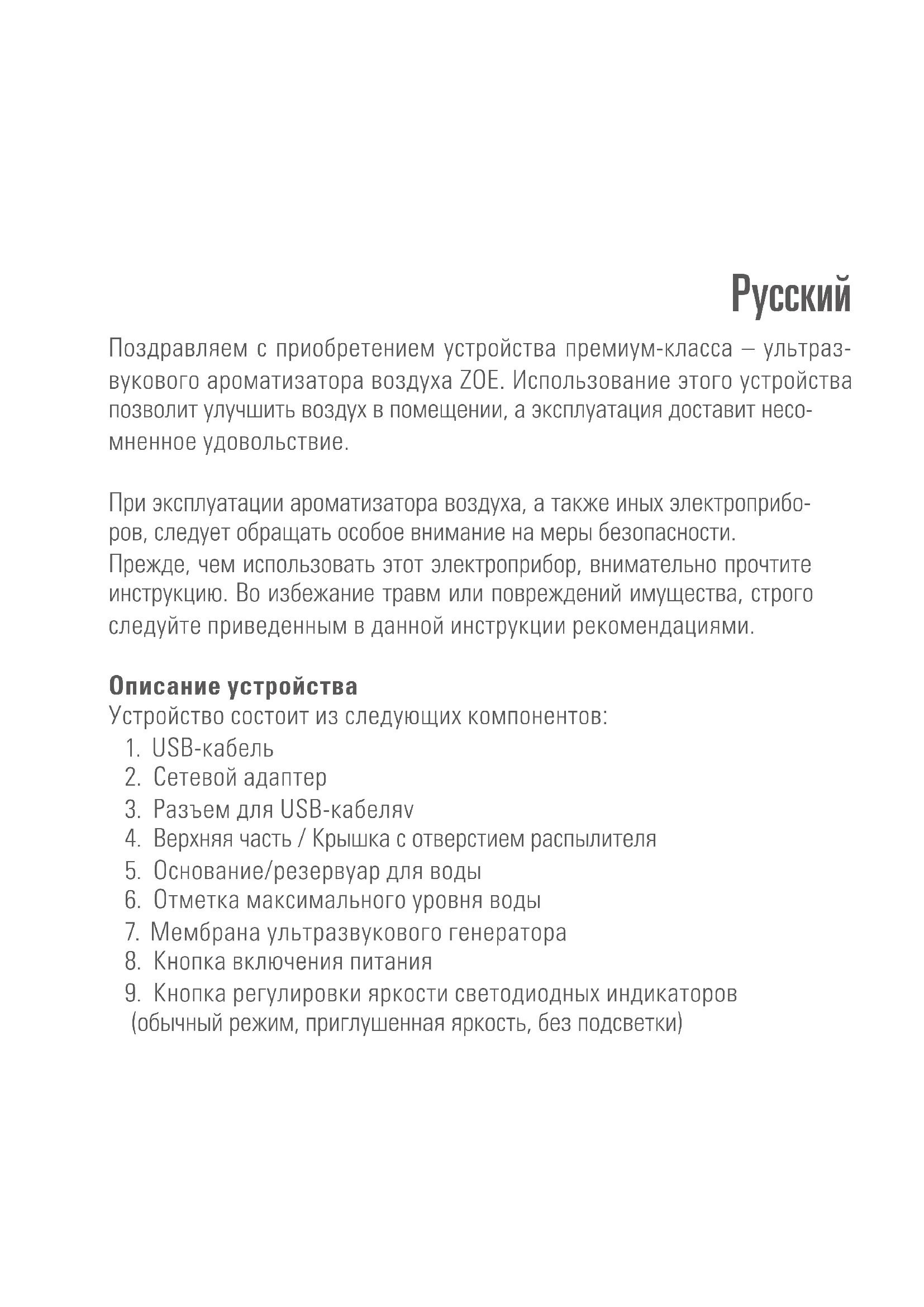 - Ароматизатор воздуха является бытовым электроприбором и пред- назначен для использования только в домашних условиях в строгом соответствии с инструкцией по эксплуатации. Неправильная эксплу- атация и техническая модификация электроприбора могут создать условия, опасные для жизни и здоровья пользователя.