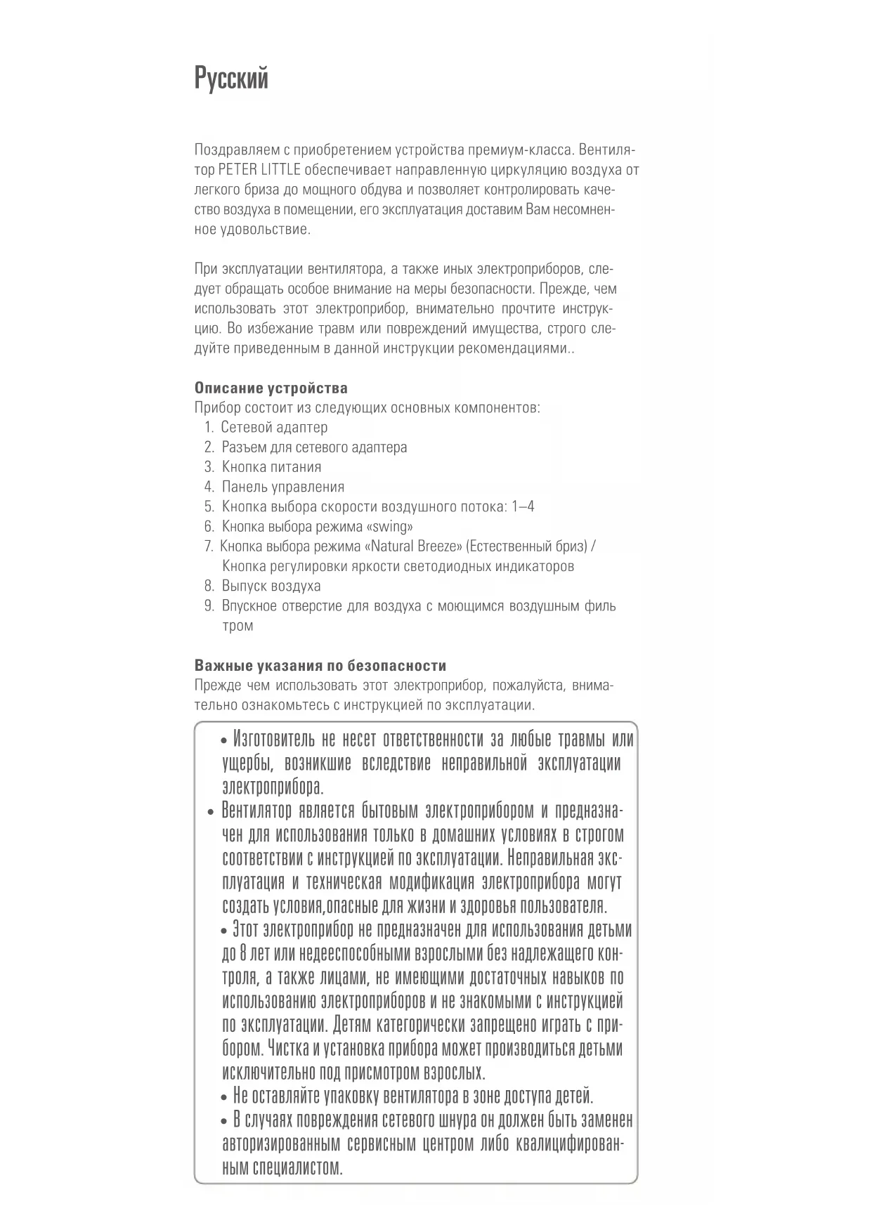 - Вентилятор является бытовым электроприбором и предназна- чен для использования только в домашних условиях в строгом соответствии с инструкцией по эксплуатации. Неправильная экс- плуатация и техническая модификация электроприбора могут создать условия,опасные для жизни и здоровья пользователя.