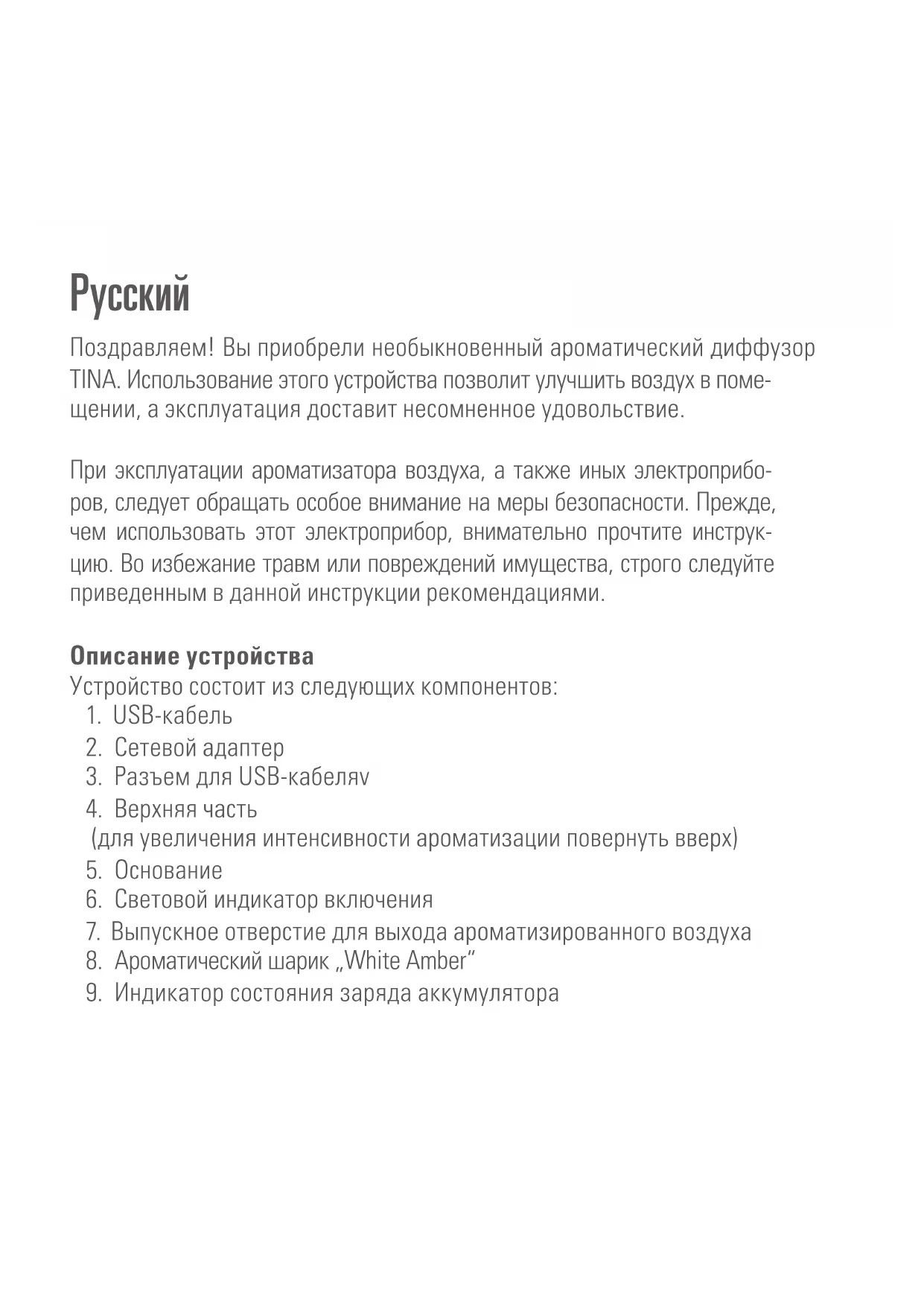 - Уровень заряда аккумулятора 10 % или ниже: светодиодный индика- тор мигает.• Аккумулятор заряжается: светодиодный индикатор горит постоянно. При полной зарядке аккумулятора прибора светодиодный индикатор гаснет. Вы можете отсоединить USB-кабель и использовать прибор в режиме работы аккумулятора, без подключения его к электросети (до 30 ч). Указание: Наш ассортимент включает в себя 6 ароматических шариков: White Amber, Orange Bergamot, Red Jasmine, Blue Rosewood, Black Orchid, Yellow Vanilla. Ароматические шарики Вы можете купить у дилера, у кото- рого Вы приобрели ароматизатор Tina. Обслуживание и чистка Внимание! Во избежание поражения электротоком никогда не погружай- те ароматизатор воздуха в воду. Перед чисткой, а также после использо- вания, обязательно отключайте ароматизатор воздуха от электросети.