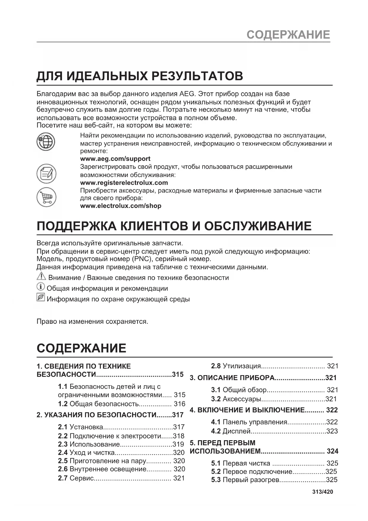 www.aeg.com/support Зарегистрировать свой продукт, чтобы пользоваться расширенными возможностями обслуживания: www.registerelectrolux.com Приобрести аксессуары, расходные материалы и фирменные запасные части для своего прибора: www.electrolux.com/shop ПОДДЕРЖКА КЛИЕНТОВ И ОБСЛУЖИВАНИЕ Всегда используйте оригинальные запчасти. При обращении в сервис-центр следует иметь под рукой следующую информацию: Модель, продуктовый номер (PNC), серийный номер. Данная информация приведена на табличке с техническими данными. Внимание / Важные сведения по технике безопасности Общая информация и рекомендации Информация по охране окружающей среды Право на изменения сохраняется.