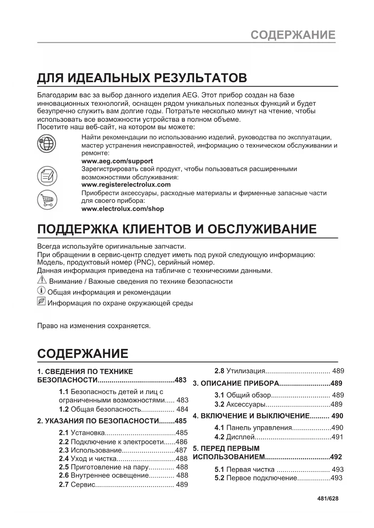 www.aeg.com/support Зарегистрировать свой продукт, чтобы пользоваться расширенными возможностями обслуживания: www.registerelectrolux.com Приобрести аксессуары, расходные материалы и фирменные запасные части для своего прибора: www.electrolux.com/shop ПОДДЕРЖКА КЛИЕНТОВ И ОБСЛУЖИВАНИЕ Всегда используйте оригинальные запчасти. При обращении в сервис-центр следует иметь под рукой следующую информацию: Модель, продуктовый номер (PNC), серийный номер. Данная информация приведена на табличке с техническими данными. Внимание / Важные сведения по технике безопасности Общая информация и рекомендации Информация по охране окружающей среды Право на изменения сохраняется.