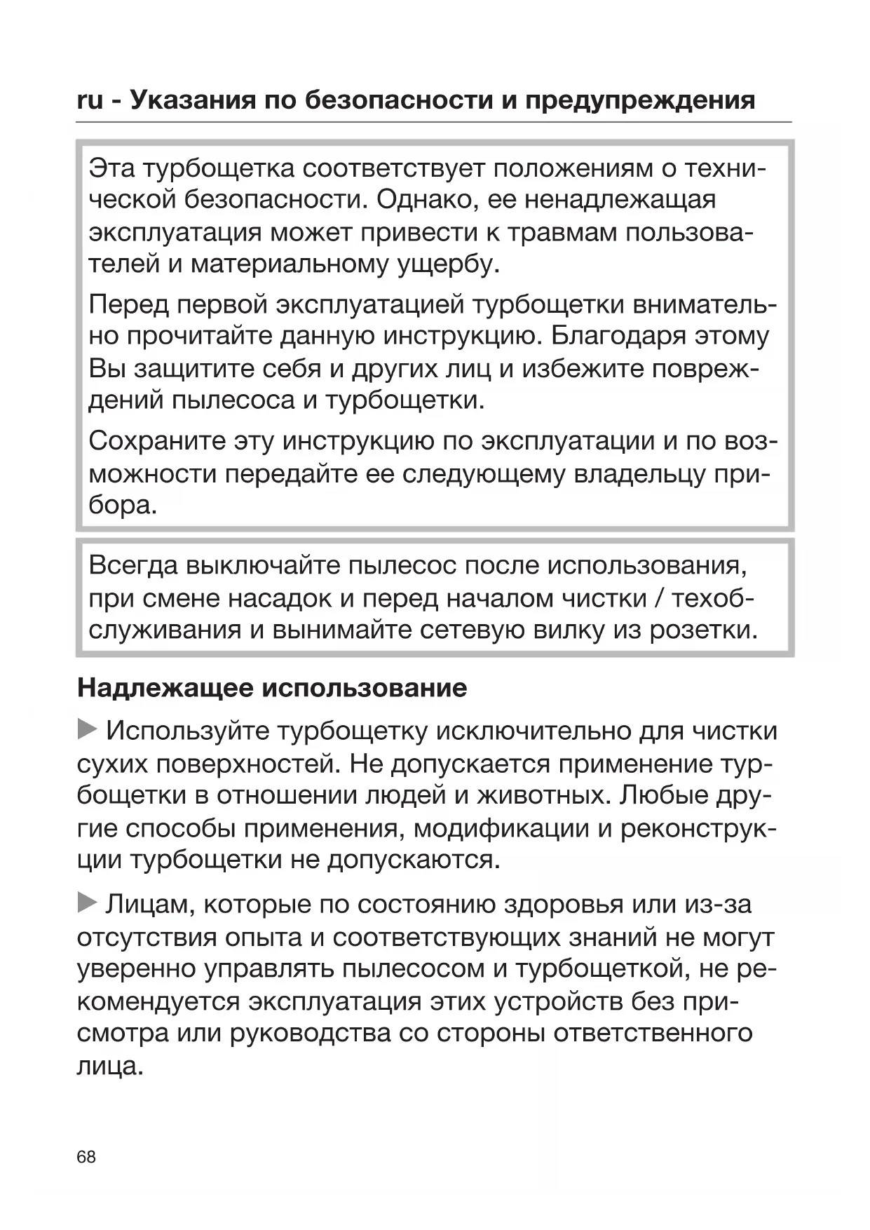 Не оставляйте без надзора детей, если они находят- ся вблизи пылесоса и турбощетки. Никогда не позво- ляйте детям играть с пылесосом и турбощеткой. Техническая безопасность Перед использованием проверяйте отсутствие у тур- бощетки видимых повреждений. Не пользуйтесь по- врежденной турбощеткой.ru - Указания по безопасности и предупреждения