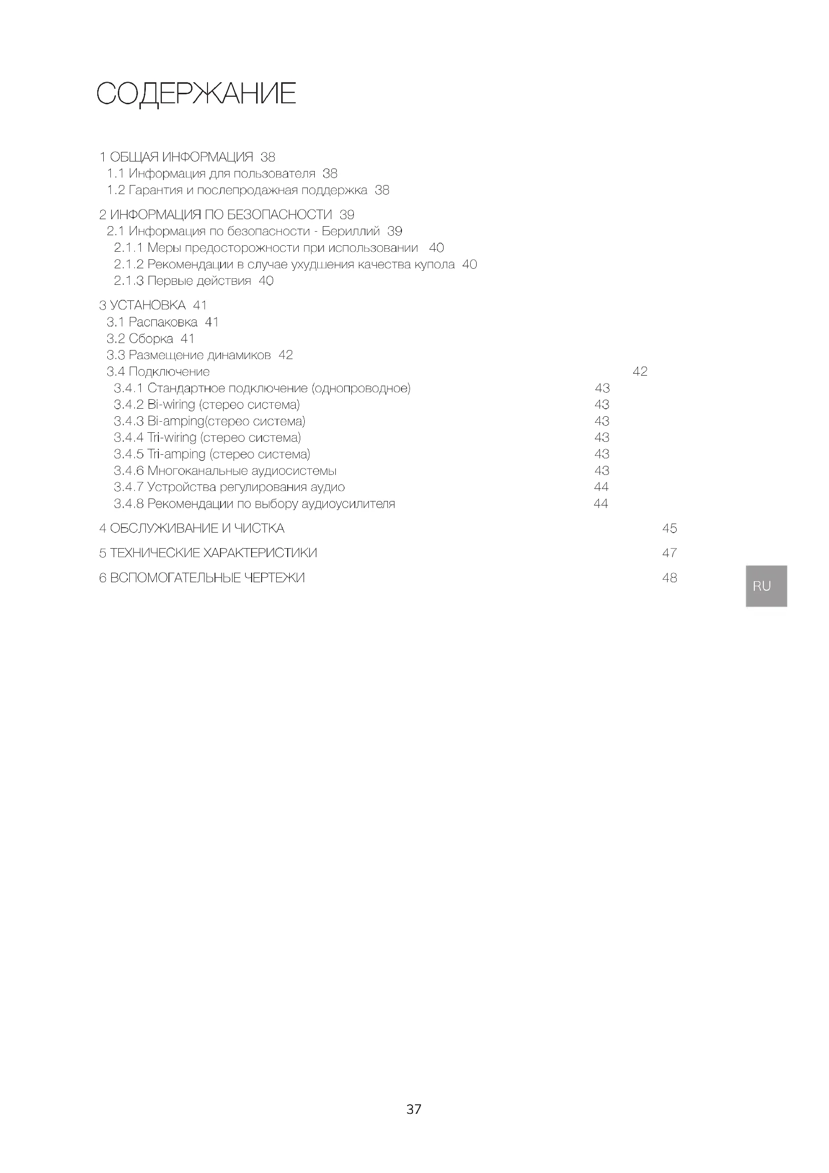 4 ОБСЛУЖИВАНИЕ И ЧИСТКА Акустические системы не требуют каких-либо особых операций по техническому обслуживанию, кроме периодической общей чистки. В целях сохранности отделки акустических систем их следует накрывать входящей в комплект поставки пылезащитной накидкой из ткани, особенно если планируется не использовать систему в течение длительного времени. Не используйте такие продукты, как воск или чистящие средства для чистки деревянных деталей, так как они могут оставить пятна или повредить древесину или саму акустическую систему. Используйте мягкую ткань (например, микрофибру, как та, которая входит в комплект), слегка смочив ее в случае необходимости жидкостью, входящей в поставляемый комплект для чистки. Древесина является натуральным живым материалом, подверженным воздействию окружающей среды. Рекомендуется устанавливать акустические системы вдали от источников тепла или окон, особенно в летние месяцы. Избегайте попадания на акустические системы прямых солнечных лучей. Используйте мягкую кисть для удаления пыли, которая может накапливаться на корпусе, на передних панелях и на самих динамиках, стараясь не повредить тонкие мембраны громкоговорителей. Для очистки мраморных частей основания акустической системы и стойки рекомендуется использовать ткань, смоченную водой или обычными жидкими нейтральными моющими средствами с низким содержанием щелочи. Не используйте агрессивные сильнодействующие химические продукты, такие как ацетон, трихлорэтилен, кислоты, абразивные вещества, сильные обезжиривающие средства, спирт, лимон или вино. Для очистки металлических и стеклянных поверхностей, если они имеются, используйте входящую в комплект поставки ткань и жидкость. Прочие конкретные рекомендации и инструкции приведены в разделе 6 (Вспомогательные чертежи). Эти меры помогут вам поддерживать отличную работу вашей акустической системы в течение долгих лет. Со временем звучание улучшится благодаря приработке движущихся частей динамиков (мембран и подвески), и акустическая камера привыкнет к часто воспроизводимой музыке по мере ее проигрывания – так же, как это происходит с акустикой струнных инструментов! Опасность повреждения корпуса акустической системы! Не используйте чистящие средства, мебельный воск, жидкие моющие средства или спирт. Не используйте тряпки из грубой ткани.46 Type Floorstanding 3.5ways,6speakers Sound emission Direct Acoustical loading Bass-Reex,Flooremission(woofers)/Rear(midrange)ports.“StealthReex”techno- logy Cabinet Multilayeredwood(sides)andLeathernishingHighdensitywoodber(cabinet).Mas- sive Avional top and basis Drivers Tweeter:30mmDiamondLikeCarbonBerylliumdomediaphragm Midrange:150mmcompositecone,Ndmagnet Woofers:2x180mmcompositecone,Femagnet Infra-woofers:2x220mmNanocarbonFiber/NomexHoneycombLongThrowSubwoofer Crossover frequency 250 Hz and 2,500 Hz Frequency response 25 Hz – 35,000 Hz Sensitivity (2.83 V @1 m) 92 dBSPL Nominal impedance 4ohm Wiring options Single/Bi-wiring Suggestedamplier power output 100W–800W,withoutclipping Dimensions(hxwxd) 1,450x398x622mm Weight 84Kgeach Packagingcontent 1 Manual 1USBstick 8Spikesand8oordisks 4Spikelocknuts 2 Front grilles 4 Side grilles 1Allenwrench 1Microbrecloth 1Cleaningkit 2 Fabric dust guards Special features - Optionals - 5 TECHNICAL SPECIFICATIONS47 5 ТЕХНИЧЕСКИЕ ХАРАКТЕРИСТИКИ