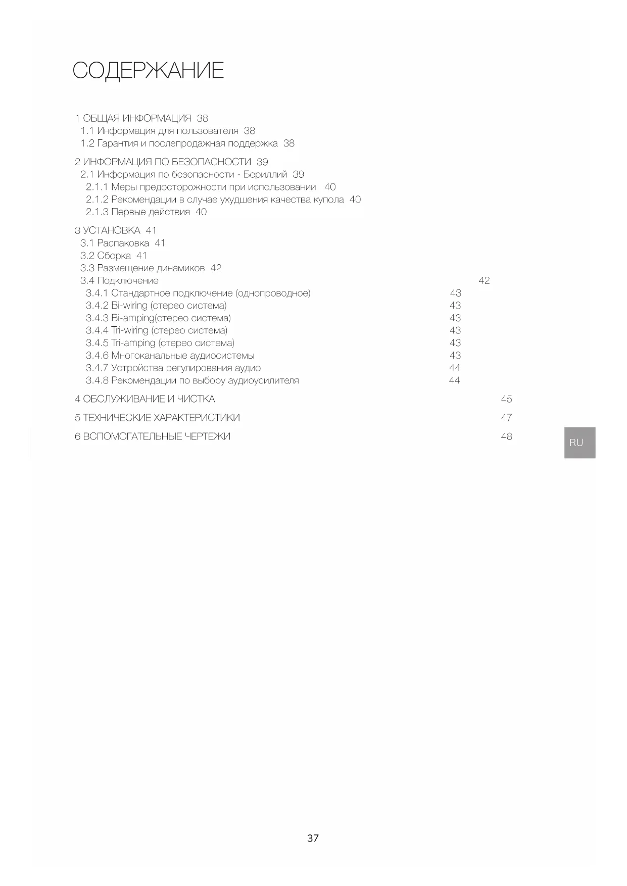 - Акустические системы предназначены для домашнего использования. Они не должны использоваться на высокой громкости с непрерывным распространением звука, как, например, для дискотек или для звукового усиления. При таком типе применения интенсивность используемого сигнала несовместима с правильной работой акустической системы и может привести к необратимому выходу из строя и, в некоторых случаях, к возгоранию. Из-за потенциальной опасности бериллия, материала, из которого сделан высокочастотный динамик, пользователь должен соблюдать определенные меры предосторожности, чтобы избежать риска абсорбции указанного материала, как описано ниже. Однако в его твердой форме и с учетом имеющейся информации на дату публикации этой брошюры риски ограничены, учитывая, что опасность продукта в основном связана с его вдыханием, абсорбцией или контактом в виде паров или микрочастиц.