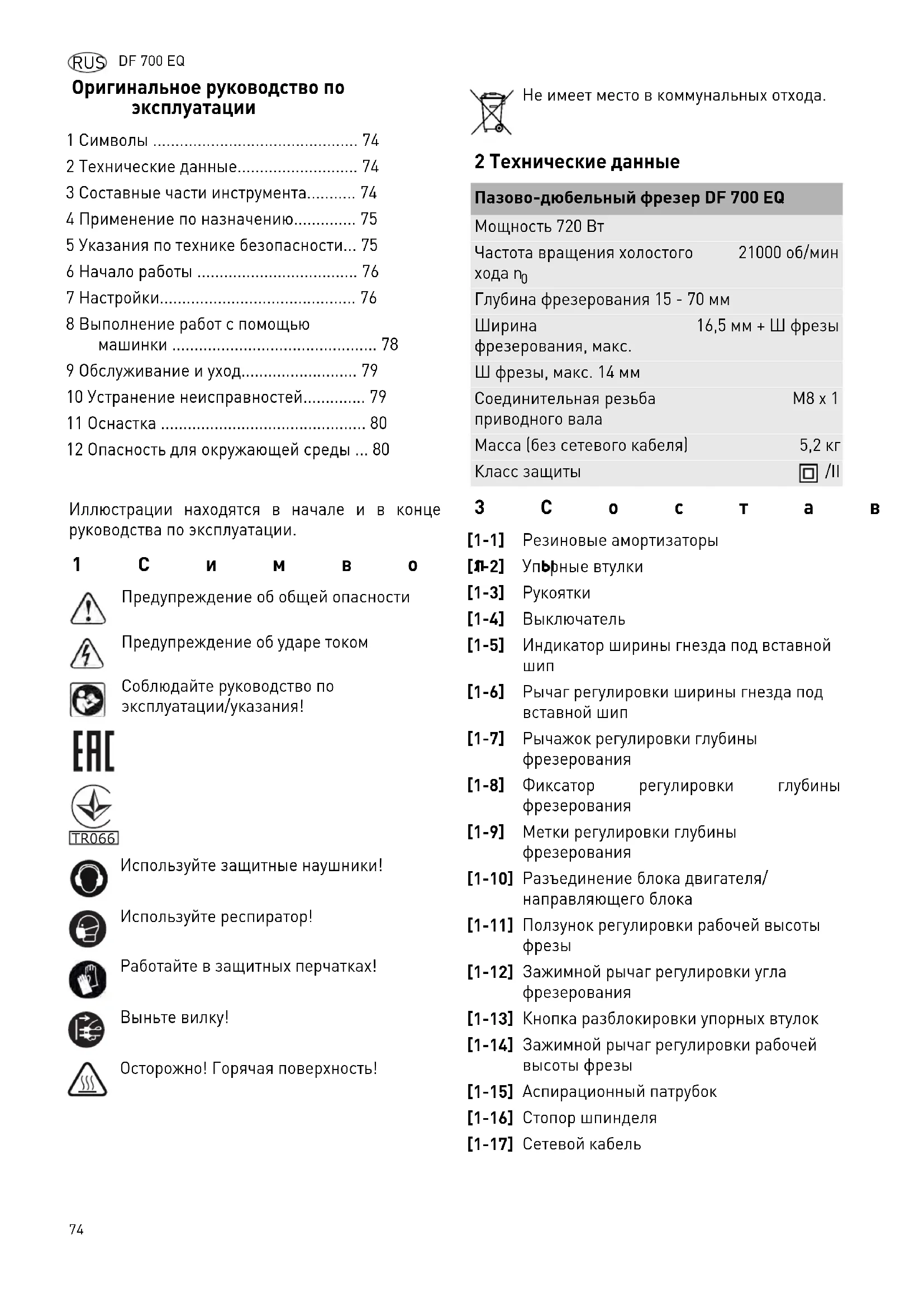 [1-12] Зажимной рычаг регулировки угла фрезерования [1-13] Кнопка разблокировки упорных втулок [1-14] Зажимной рычаг регулировки рабочей высоты фрезы [1-15] Аспирационный патрубок [1-16] Стопор шпинделя [1-17] Сетевой кабельDF 700 EQ