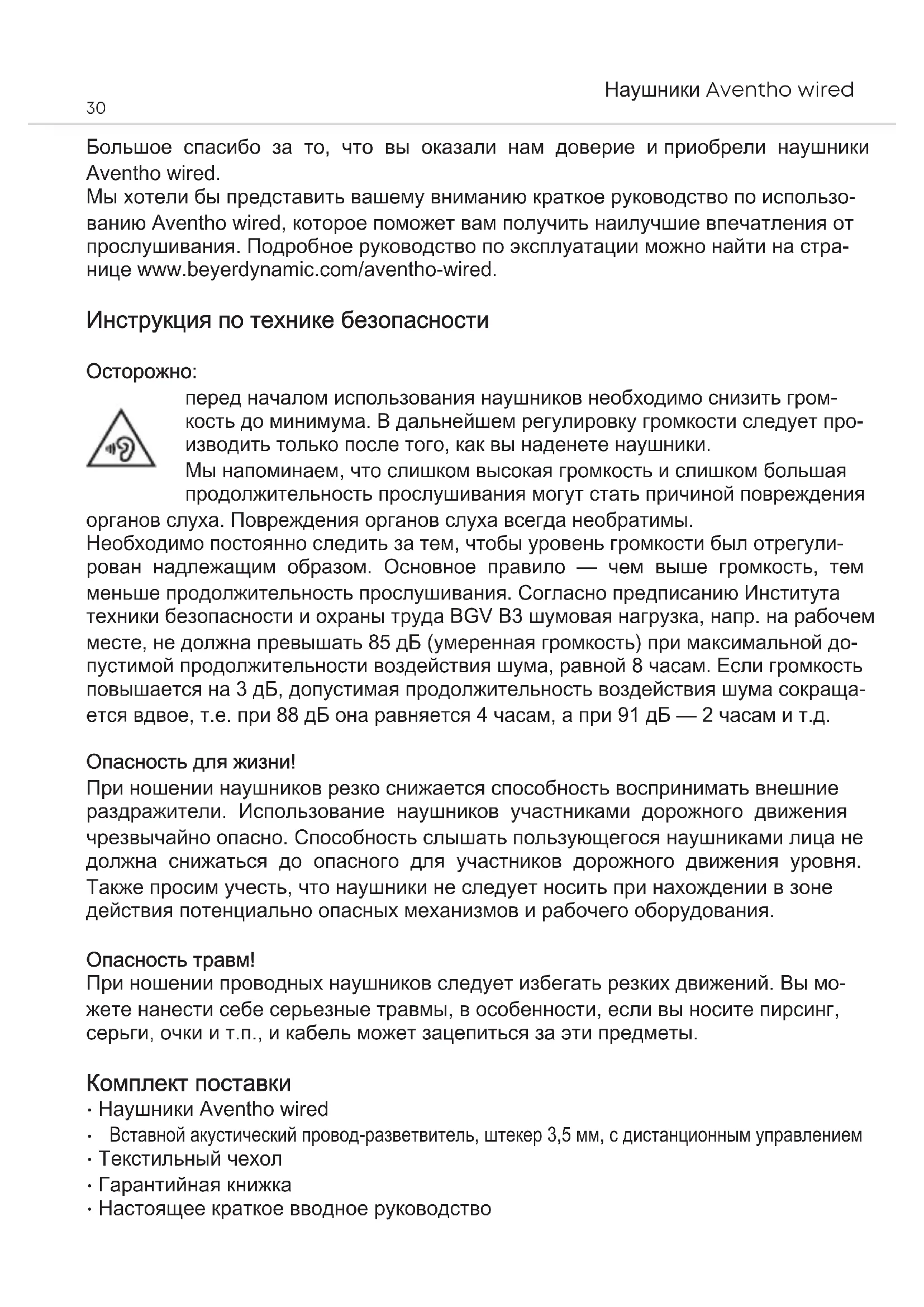 Большое спасибо за то, что вы оказали нам доверие и приобрели наушники Aventho wired. Мы хотели бы представить вашему вниманию краткое руководство по использо- ванию Aventho wired, которое поможет вам получить наилучшие впечатления от прослушивания. Подробное руководство по эксплуатации можно найти на стра- нице www.beyerdynamic.com/aventho-wired. Инструкция по технике безопасности