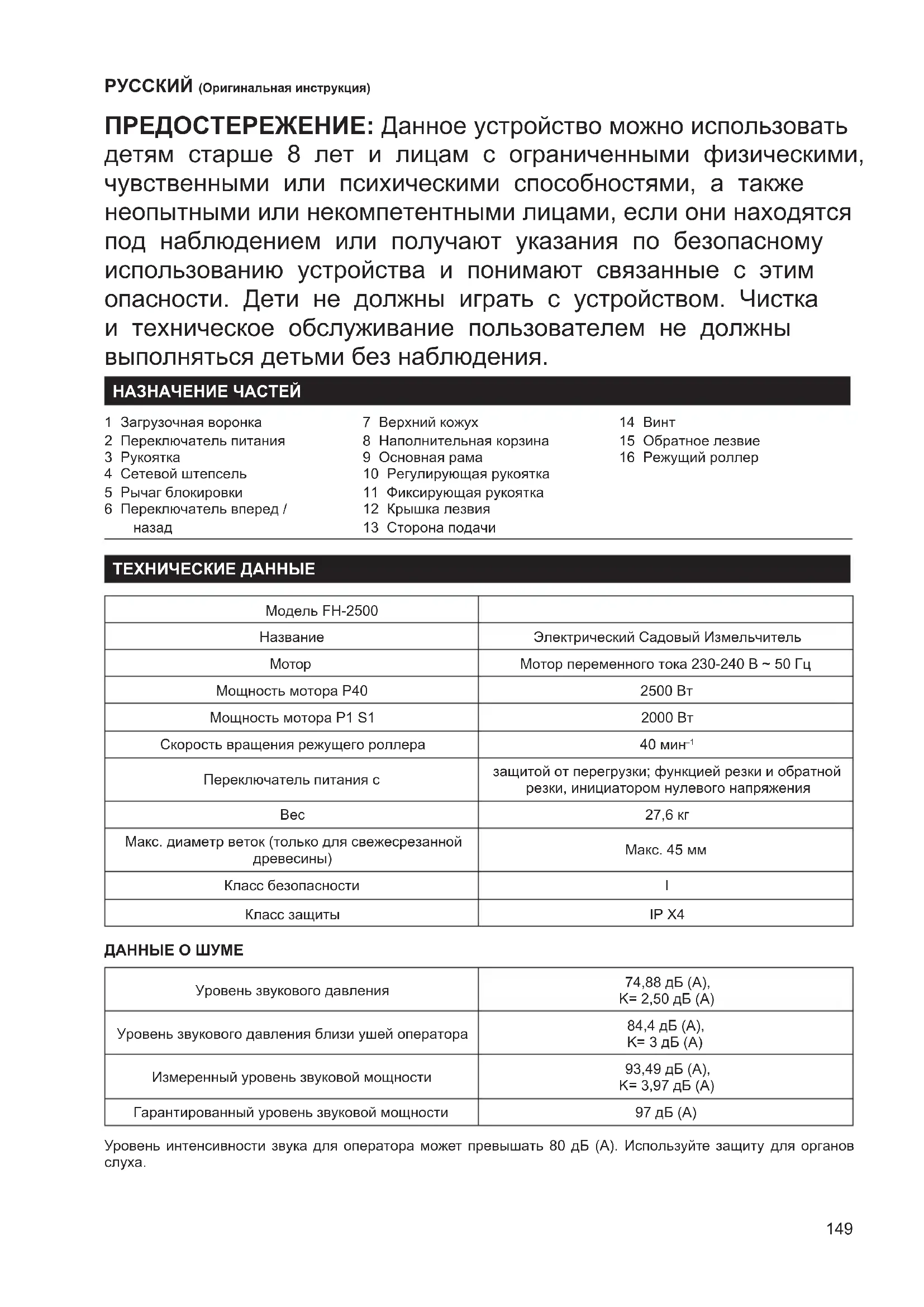 7 Верхний кожух 8 Наполнительная корзина 9 Основная рама 10 Регулирующая рукоятка 11 Фиксирующая рукоятка 12 Крышка лезвия 13 Сторона подачи 14 Винт 15 Обратное лезвие 16 Режущий роллер ТЕХНИЧЕСКИЕ ДАННЫЕ Модель FH-2500 Название Электрический Садовый Измельчитель Мотор Мотор переменного тока 230-240 В ~ 50 Гц Мощность мотора P40 2500 Вт Мощность мотора P1 S1 2000 Вт Скорость вращения режущего роллера 40 мин