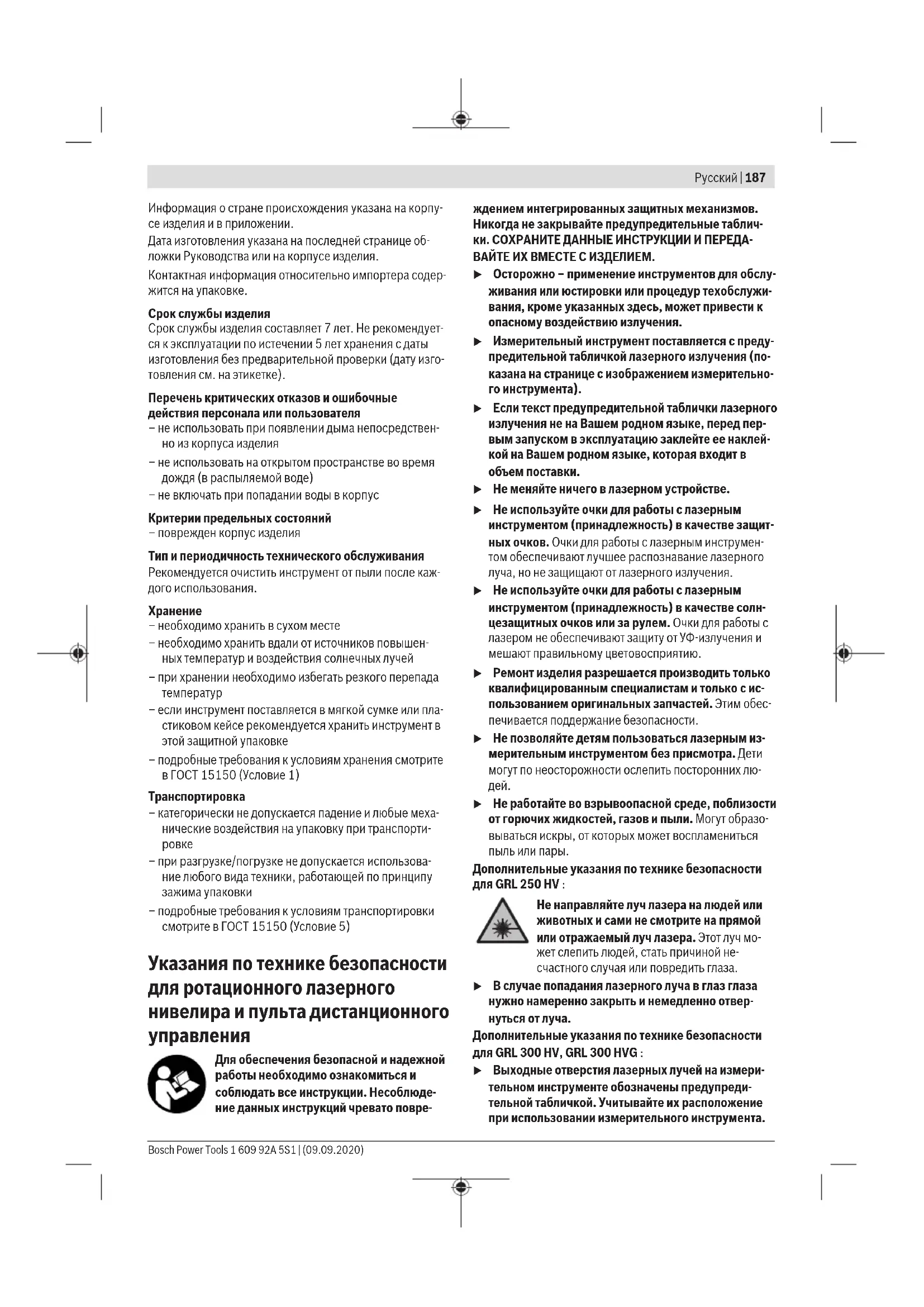 u Не работайте во взрывоопасной среде, поблизости от горючих жидкостей, газов и пыли. Могут образо- вываться искры, от которых может воспламениться пыль или пары. Дополнительные указания по технике безопасности для GRL250HV : Не направляйте луч лазера на людей или животных и сами не смотрите на прямой или отражаемый луч лазера. Этот луч мо- жет слепить людей, стать причиной не- счастного случая или повредить глаза. u В случае попадания лазерного луча в глаз глаза нужно намеренно закрыть и немедленно отвер- нуться от луча. Дополнительные указания по технике безопасности для GRL300HV, GRL300HVG : u Выходные отверстия лазерных лучей на измери- тельном инструменте обозначены предупреди- тельной табличкой. Учитывайте их расположение при использовании измерительного инструмента. Bosch Power Tools 1 609 92A 5S1 | (09.09.2020)188 | Русский u Если текст соответствующей предупредительной таблички не на Вашем родном языке, перед пер- вым запуском в эксплуатацию заклейте ее наклей- кой на Вашем родном языке, которая входит в комплект поставки. u При использовании лазера с лазерным излучением класса 3R соблюдайте национальные предписания. Несоблюдение этих предписаний может привести к
