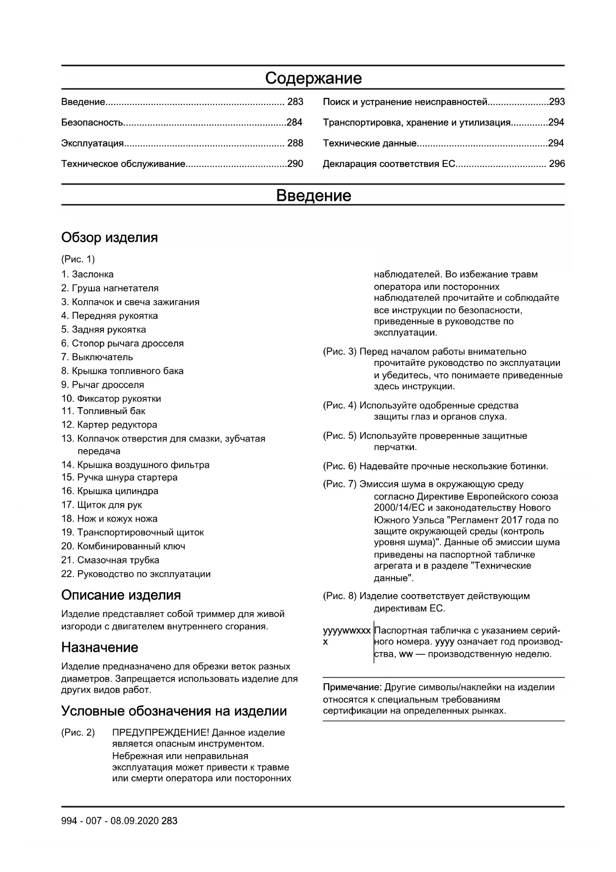 виброгасящих элементов. (Pис. 16) Проверка глушителя ПРЕДУПРЕЖДЕНИЕ: Запрещается использовать изделие без глушителя или с неисправным глушителем. Повреждение глушителя может привести к увеличению уровня шума и риску возгорания. Запрещается использовать изделие без искрогасительной сетки или со сломанной сеткой. В случае повреждения искрогасительную сетку следует заменить. ПРЕДУПРЕЖДЕНИЕ: Глушители сильно нагреваются в ходе работы и остаются нагретыми после окончания работы, а также во время работы двигателя на холостых оборотах. ВНИМАНИЕ: Если искрогасительная сетка часто бывает засорена, это может быть признаком нарушения работы катализатора. Обратитесь к своему сервисному дилеру для проверки глушителя. При засорении искрогасительной сетки возможен перегрев двигателя, что приведет к повреждению цилиндра и поршня. 286 994 - 007 - 08.09.2020ПРЕДУПРЕЖДЕНИЕ: На внутренней поверхности глушителя скапливаются химикаты, которые могут вызывать раковые заболевания. В случае повреждения глушителя соблюдайте осторожность и не касайтесь этих