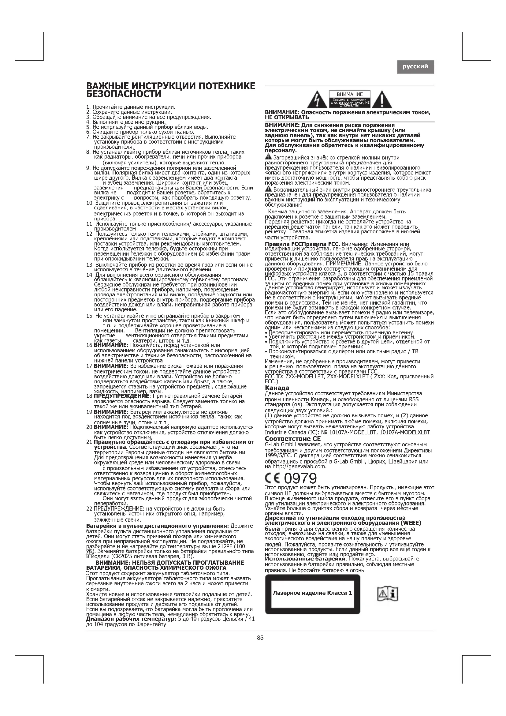 1. Прочитайте данные инструкции.2. Сохраните данные инструкции.3. Обращайте внимание на все предупреждения.4. Выполняйте все инструкции.5. Не используйте данный прибор вблизи воды.6. Очищайте прибор только сухой тканью.7. Не закрывайте вентиляционные отверстия. Выполняйте установку прибора в соответствии с инструкциями производителя.8. Не устанавливайте прибор вблизи источников тепла, таких как радиаторы, обогреватели, печи или прочих приборов (включая усилители), которые выделяют тепло.9. Не допускайте повреждения полярной или заземленной вилки. Полярная вилка имеет два контакта, один из которых шире другого. Вилка с заземлением имеет два контакта и зубец заземления. Широкий контакт или зубец заземления предназначены для Вашей безопасности. Если вилка не подходит к Вашей розетке, обратитесь к электрику с вопросом, как подобрать походящую розетку.10. Защитите провод электропитания от зажатия или сдавливания, в частности в местах установки вилок, электрическиз розеток и в точке, в которой он выходит из прибора.11. Используйте только приспособления/ аксессуары, указанные производителем12. Пользуйтесь только теми тележками, стойками, штативами, креплениями или подставками, которые входят в комплект поставки устройства, или рекомендованы изготовителем. Когда используется тележка, будьте осторожны при перемещении тележки с оборудованием во избежании травм при опрокидывании тележки.13. Выключайте прибор из розетки во время гроз или если он не используется в течение длительного времени.14. Для выполнения всего сервисного обслуживания обращайтесь к квалифицированному сервисному персоналу. Сервисное обслуживание требуется при возникновении любой неисправности прибора, например, повреждение провода электропитания или вилки, попадание жидкости или посторонних предметов внутрь прибора, подвергание прибора воздействию дождя или влаги, неправильная работа прибора или его падение.15. Не устанавливайте и не встраивайте прибор в закрытом или замкнутом пространстве, таком как книжный шкаф и т.п. и поддерживайте хорошее проветривание в помещении. Вентиляции не должно препятствовать укрытие вентиляционного отверстия такими предметами, как газеты, скатерти, шторы и т.д.16.ВНИМАНИЕ: Пожалуйста, перед установкой или использованием оборудования ознакомьтесь с информацией об электричестве и технике безопасности, расположенной на нижней панели устройства17.ВНИМАНИЕ: Во избежание риска пожара или поражения электрическим током, не подвергайте данное устройство воздействию дождя или влаги. Устройство не должно подвергаться воздействию капель или брызг, а также, запрещается ставить на устройство предметы, содержащие жидкость, например, вазы.18.ПРЕДУПРЕЖДЕНИЕ: При неправильной замене батарей появляется опасность взрыва. Следует заменять только на такой же или эквивалентный тип батарей.19.ВНИМАНИЕ: Батареи или аккамуляторы не должны находится под воздействием источников тепла, таких как солнечные лучи, огонь и т.п.20.ВНИМАНИЕ: Подключаемый напрямую адаптер используется как устройство отключения, устройство отключения должно быть легко доступным.21.Правильно обращайтесь с отходами при избавлении от устройства. Соответствующий знак обозначает, что на территории Европы данные отходы не являются бытовыми. Для предотвращения возможности нан
