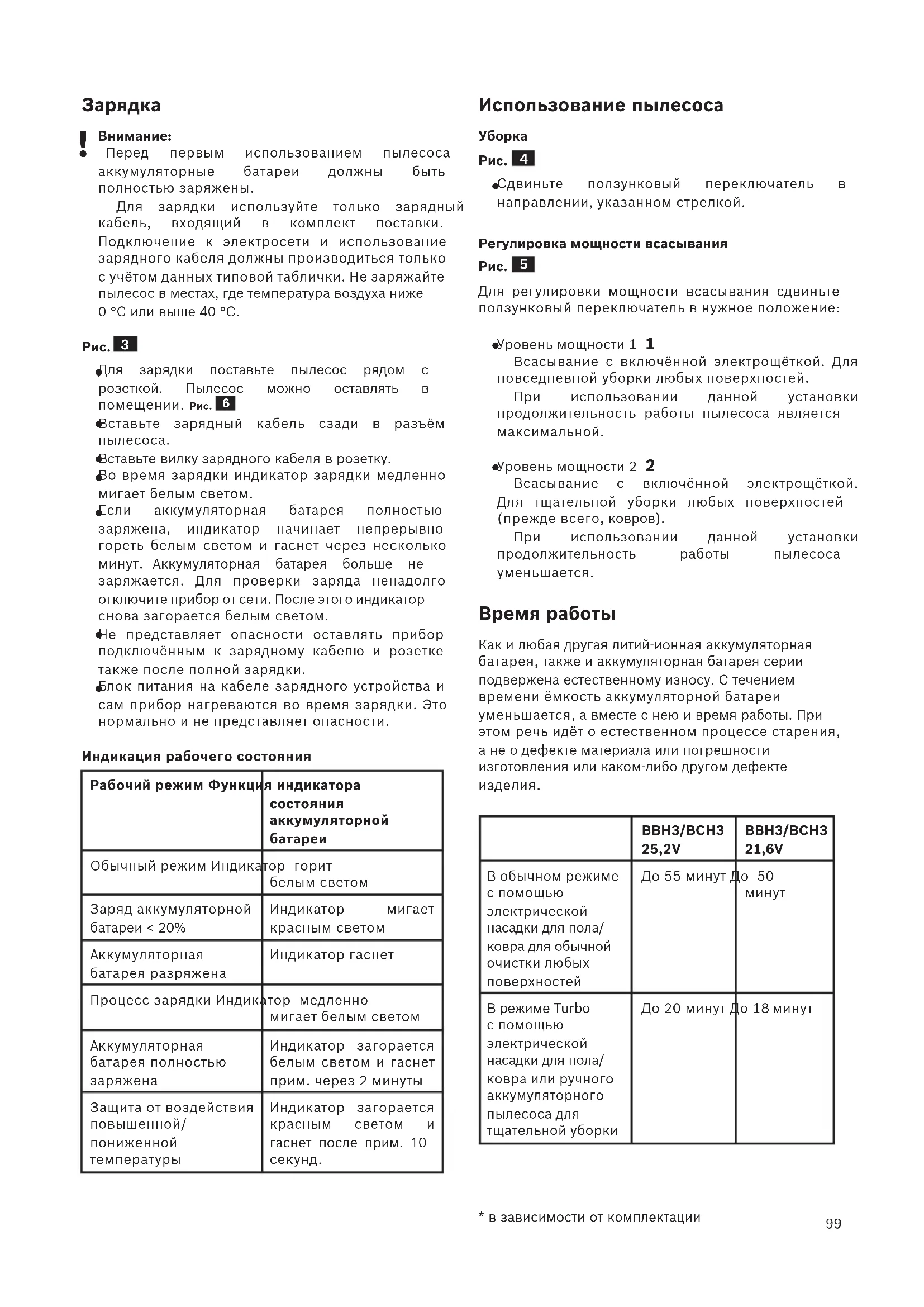 Уровень мощности 2 2 Всасывание с включённой электрощёткой. Для тщательной уборки любых поверхностей (прежде всего, ковров). При использовании данной установки продолжительность работы пылесоса уменьшается. Время работы Как и любая другая литий-ионная аккумуляторная батарея, также и аккумуляторная батарея серии подвержена естественному износу. С течением времени ёмкость аккумуляторной батареи уменьшается, а вместе с нею и время работы. При этом речь идёт о естественном процессе старения, а не о дефекте материала или погрешности изготовления или каком-либо другом дефекте