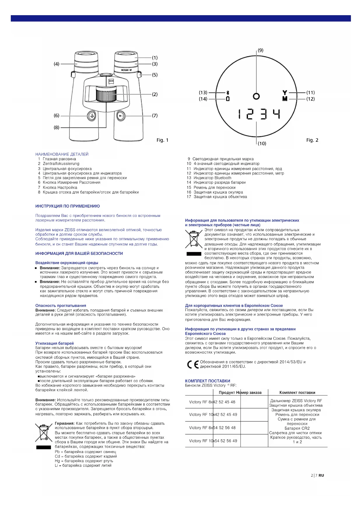 - A tartozékok nem részei a szállítási terjedelemnek! A ZEISS megbízhatóan kiemelkedő minőséget jelent. Ezért gyártóként – függetlenül az eladónak a vevővel szembeni garanciális kötelezettségétől – tíz év garanciát vállalunk erre a ZEISS-termékre. A garanciavállalás tartalma az alábbi linken tekinthető meg: www.zeiss.com/sports-optics/premium-warranty-conditions Regisztrálja termékét itt: www.zeiss.com/sports-optics/registration A kivitel és a szállítási terjedelem műszaki fejlesztés érdekében végzett módosításának jogát fenntartjuk. A tévedésekért és nyomtatási hibákért felelősséget nem vállalunk. Carl Zeiss Sports Optics GmbH ZEISS csoport Gloelstraße 3 – 5 35576 Wetzlar Németország www.zeiss.com/sports-optics Fig. 18 Fig. 19 Fig. 20ZEISS Victory RF 8x42 | 10x42 | 8x54 | 10x54 Инструкция по применению DE EN FR IT ES NL SE FI CZ PL HU RU JP CN | 01.2018 This product may be covered by one or more of the following United States patents: US6542302, US6816310, US6906862 For further United States patents which may cover this product see our website. Patents: www.zeiss.com/sports-optics/us/patents2 | 7 RU НАИМЕНОВАНИЕ ДЕТАЛЕЙ 1 Глазная раковина 2 Zentralfokussierung 3 Центральная фокусировка 4 Центральная фокусировка для индикатора 5 Петля для закрепления ремня для переноски 6 Кнопка Измерение Расстояния 7 Кнопка Настройка 8 Крышка отсека для батарейки/отсек для батарейки Информация для пользователя по утилизации электрических и электронных приборов (частные лица) Этот символ на продуктах и/или сопроводительных документах означает, что использованные электрические и электронные продукты не должны попадать в обычные домашние отходы. Для надлежащего обращения, утилилизации и вторичного использования этих продуктов отнесите их в соответствующие места сбора, где они принимаются бесплатно. В некоторых странах эти продукты, возможно, можно сдать при покупке соответствующего нового продукта в местном розничном магазине. Надлежащая утилизация данного продукта обеспечивает защиту окружающей среды и предотвращает вредное воздействие на человека и окружение, возможное при неправильном обращении с отходами. Более подробную информацию о ближайшем пункте сбора Вы можете получить в органах государственного управления. В соответствии с законодательством за неправильную утилизацию этого вида отходов может взиматься штраф. Для корпоративных клиентов в Европейском Союзе Пожалуйста, свяжитесь со своим дилером или поставщиком, если Вы хотите утилизировать электрические и электронные приборы. У него приготовлена для Вас информация. Информация по утилизации в других странах за пределами Европейского Союза Этот символ имеет силу только в Европейском Союзе. Пожалуйста, свяжитесь с органами государственного управления или Вашим дилером, если Вы хотите утилизировать этот продукт, и спросите его о возможностях утилизации. Обозначения в соответствии с директивой 2014/53/EU и директивой 2011/65/EU. КОМПЛЕКТ ПОСТАВКИ Бинокли ZEISS Victory